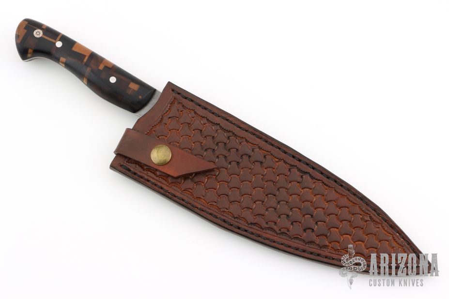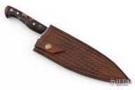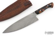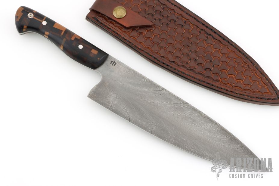 This All Out Chef's Knife by Solace Forge features a Baker Forge 9k Feather Damascus blade with .111" blade stock and 2.190" blade depth, full tang construction. The handle has Devos Woodcraft Chaos mosaic wood scales with black liners, stainless and mosaic pins. Comes with a hand tooled brown leather sheath by PFNG Leather. New from maker. Comes with COA dated Oct 1, 2025.