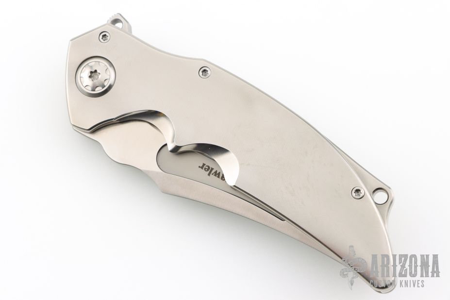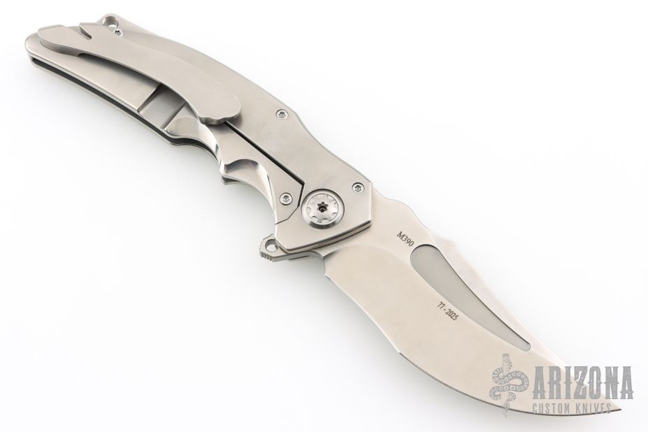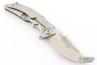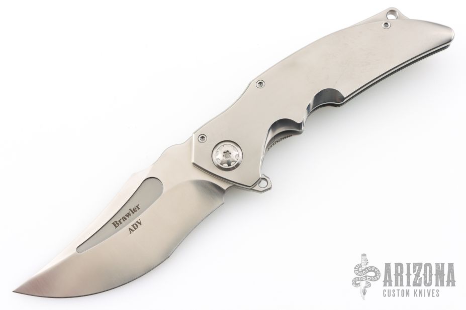 This ADV Brawler framelock flipper has a high satin finished clip point recurve blade with fuller and flipper tap. The handle has a satin finished titanium frame with stainless steel lockface insert and over travel stop. Tip up clip. Great blade seating, detent and lock up. Blade marked 77-2025. Includes maker's padded and zippered case. New from maker!