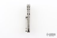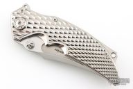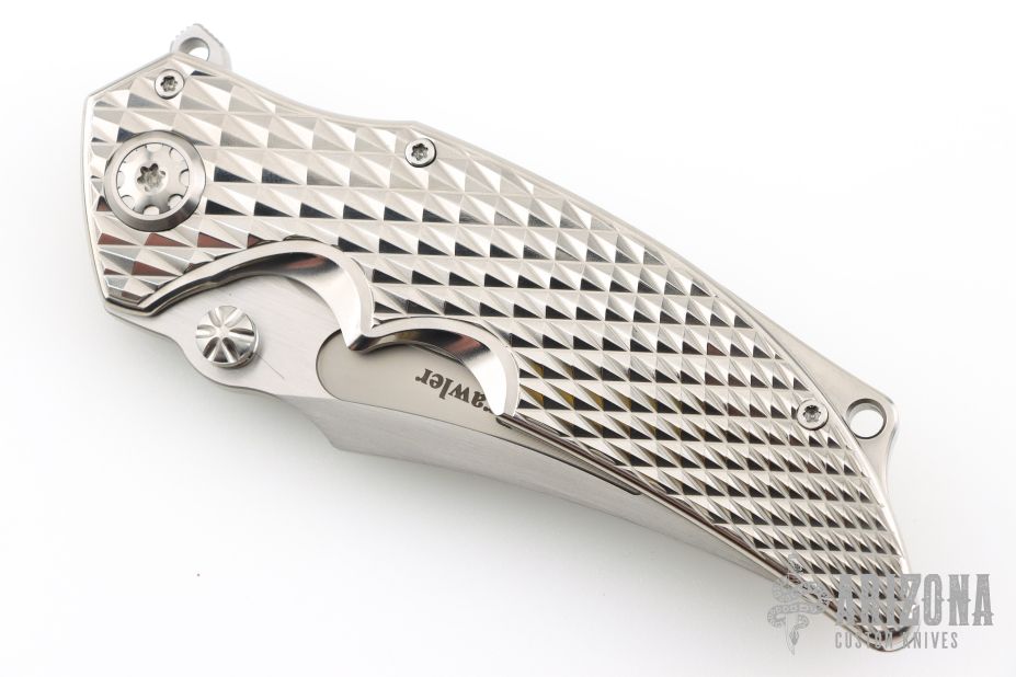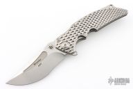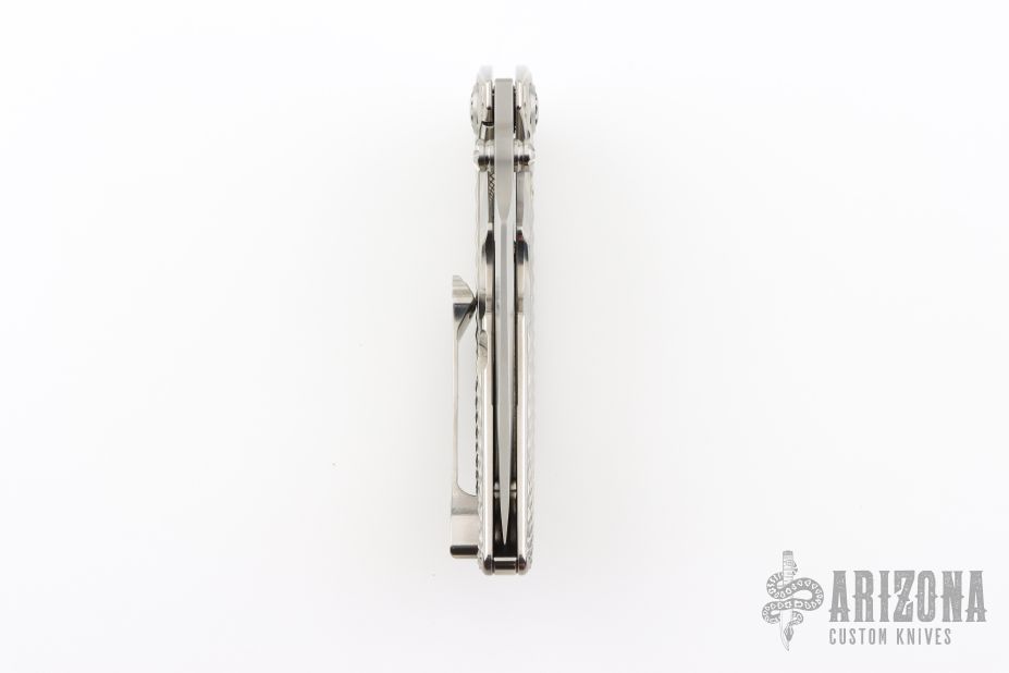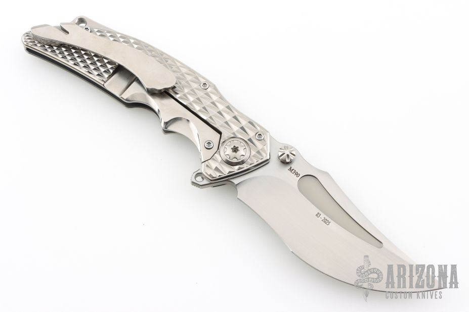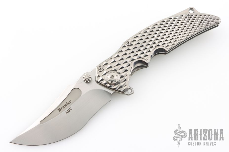 This ADV Brawler framelock flipper has a hand rub satin finished clip point recurve blade with fuller and flipper tap. The handle has a satin Diamond finished titanium frame with stainless steel lockface insert and over travel stop. Tip up clip. Great blade seating, detent and lock up. Blade marked 83-2025. Includes maker's padded and zippered case. New from maker!