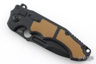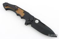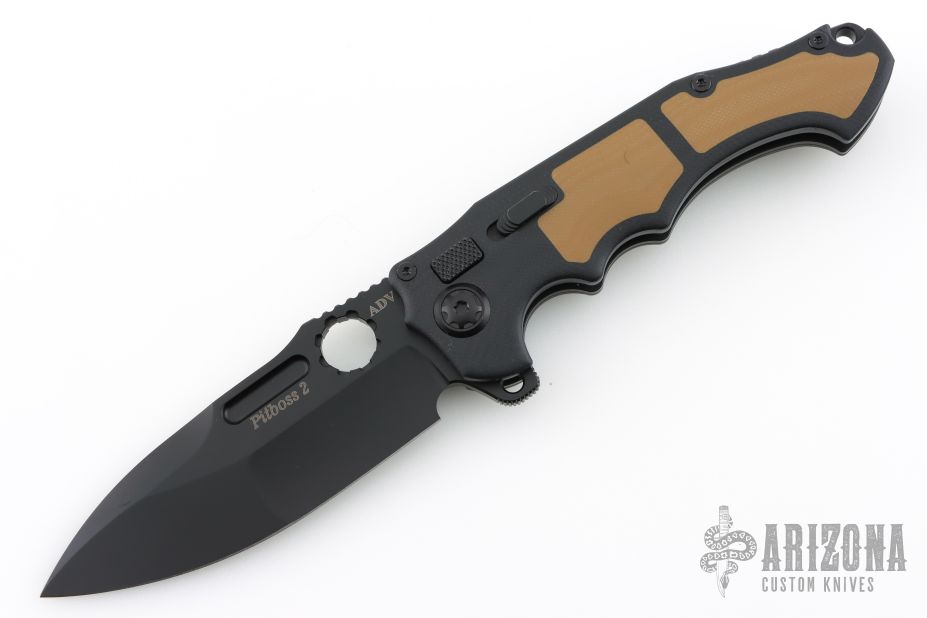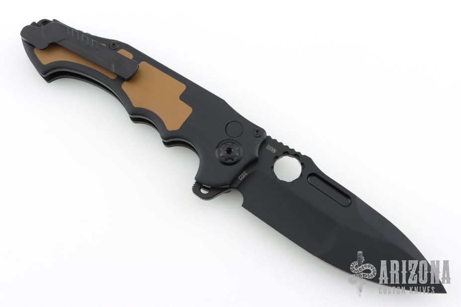 This Pitboss 2 by Andre De Villiers features a black multi-ground blade with thumbhole, notched thumbrest and flipper. It swings smoothly on a ball-bearing system and has both a thumb hole and flipper opener; it can also be opened or closed with a flick of the wrist when the inlaid button lock is held down. A safety switch on the side allows the blade to be locked in the closed position or provides an additional level of safety in the open position. It has a G10 handle with black hardware, with brown G10 inlays. A jimped black titanium backstrap with a lanyard hole and a tip-up, titanium pocket clip with hidden screws. "2022" on the ricasso.