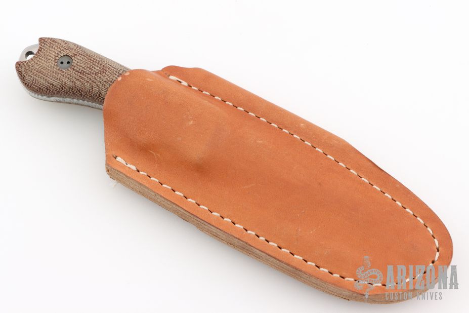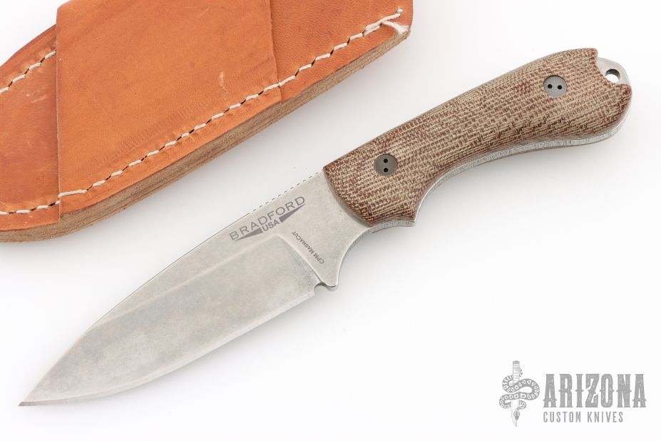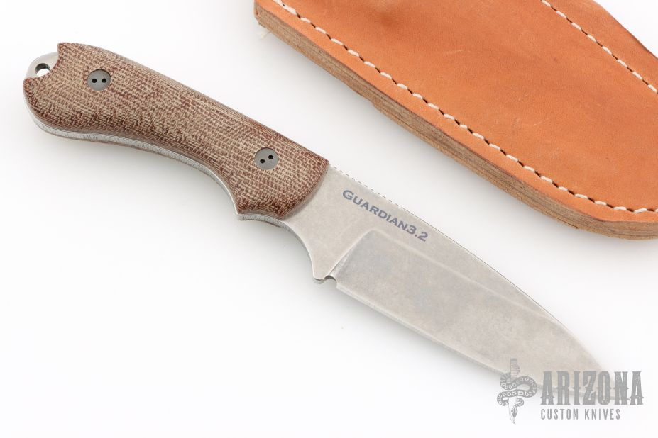This Guardian 3.2 by Bradford Knives features a stonewashed blade with notched thumbrest, .141" blade stock and 1.164" blade depth. The handle has brown canvas micarta scales over full tang construction. Exposed tang pommel with lanyard hole. Includes original box, leather sheath and papers. Excellent condition.