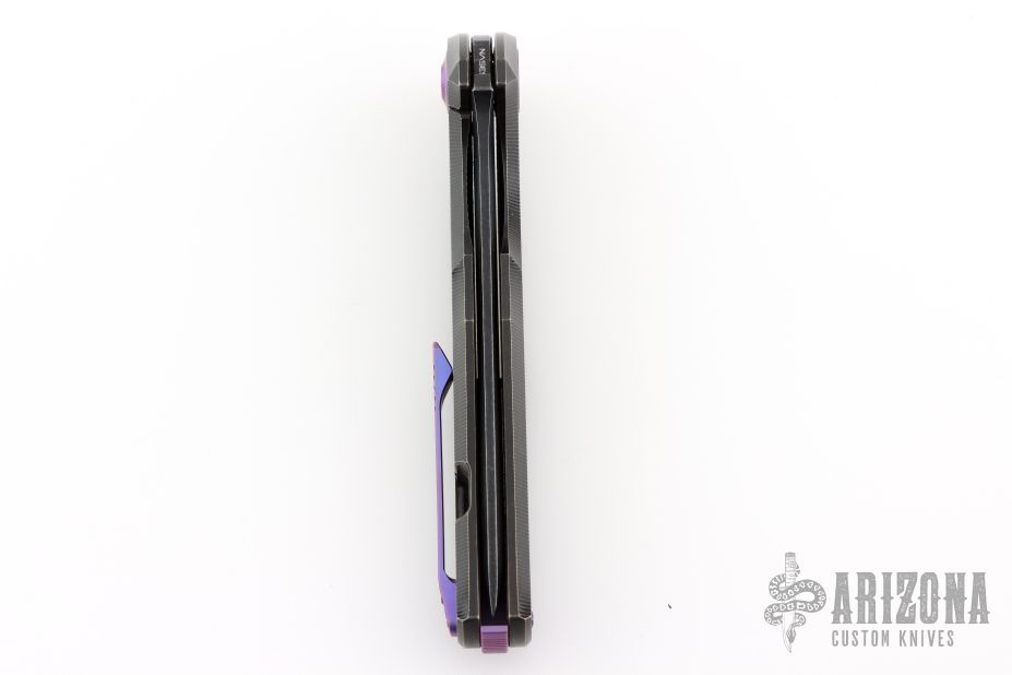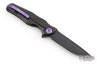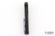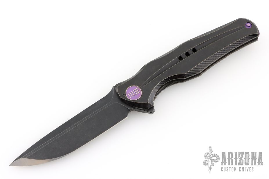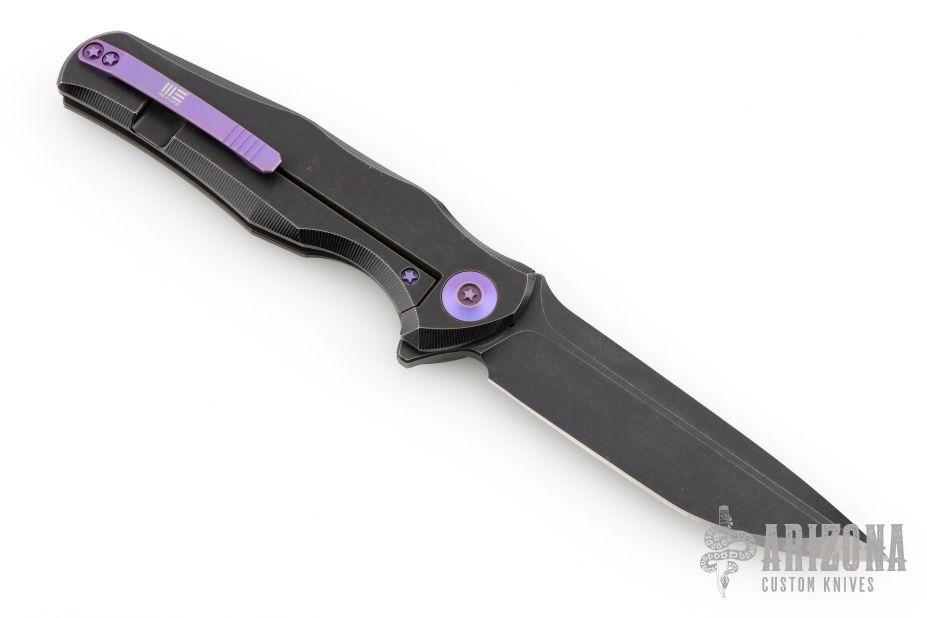 This model 601 by WE Knives features a dark stonewashed blade with false top edge and notched flipper. The handle has a dark stonewashed titanium frame with purple anodized titanium hardware and a tip up clip. Comes with original zippered case and papers. Has a couple light scratches on the clip, otherwise Excellent condition.