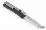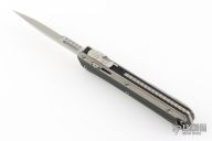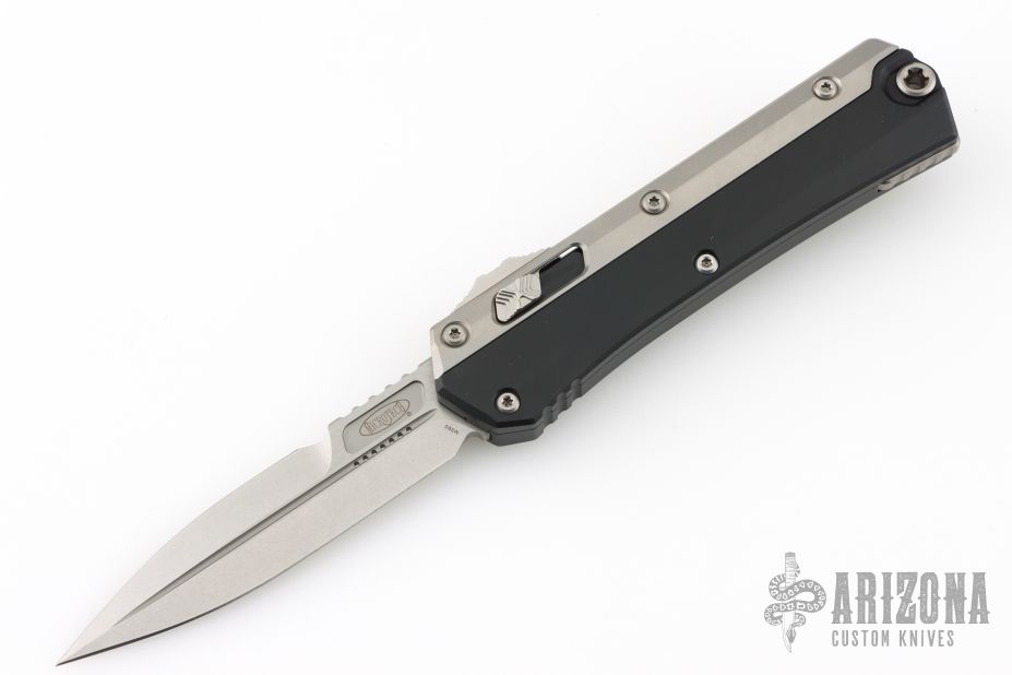This Glykon by Microtech features a stonewashed double edged blade with fullers and notched thumbrest. The handle has a black aluminum chassis with bead blasted titanium overlays and tip down clip. Comes with original box and papers. Dated 10/2023 and #4078. Excellent condition.