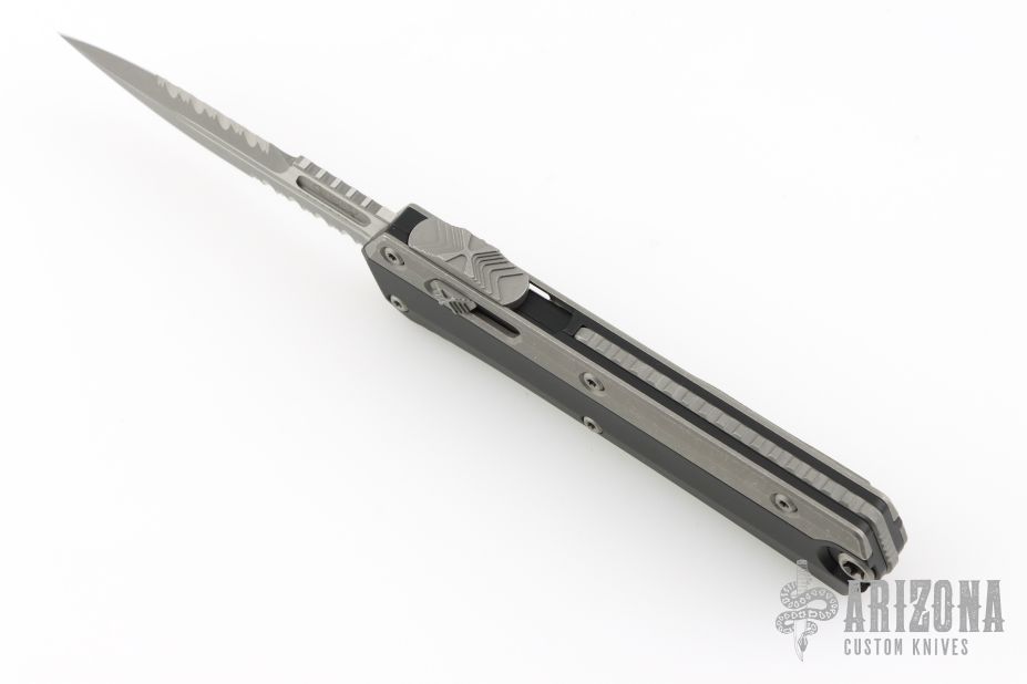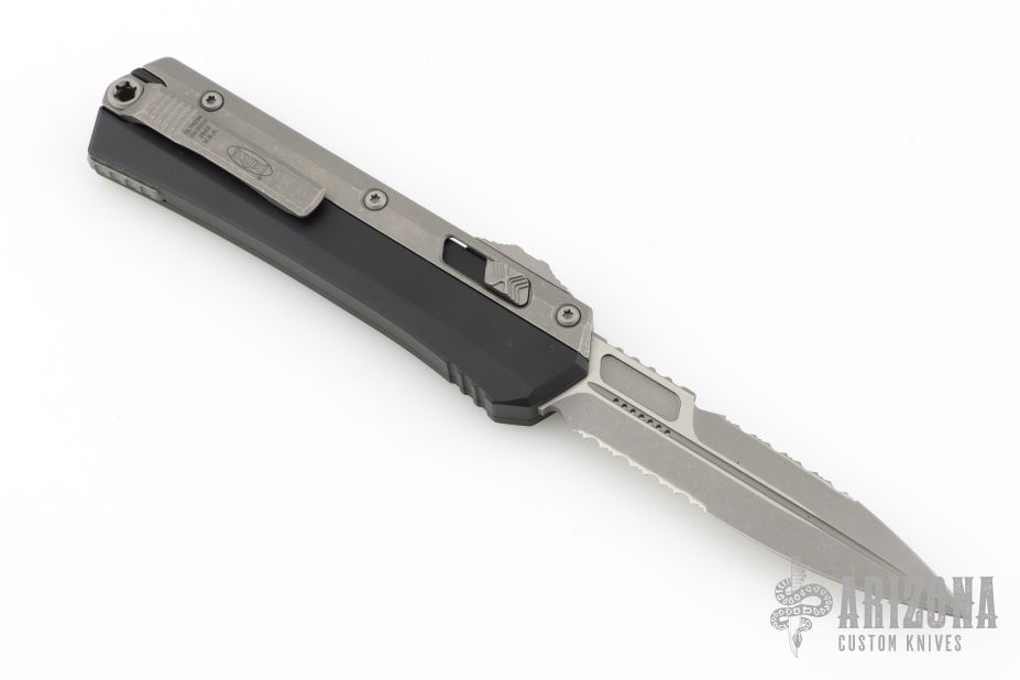 This Glykon by Microtech features a Apocalyptic double edged fully serrated blade with fullers and notched thumbrest. The handle has a black aluminum chassis with Apocalyptic  titanium overlays and tip down clip. Comes with original box and papers. Excellent condition. Dated 08/2022 and #2842.
