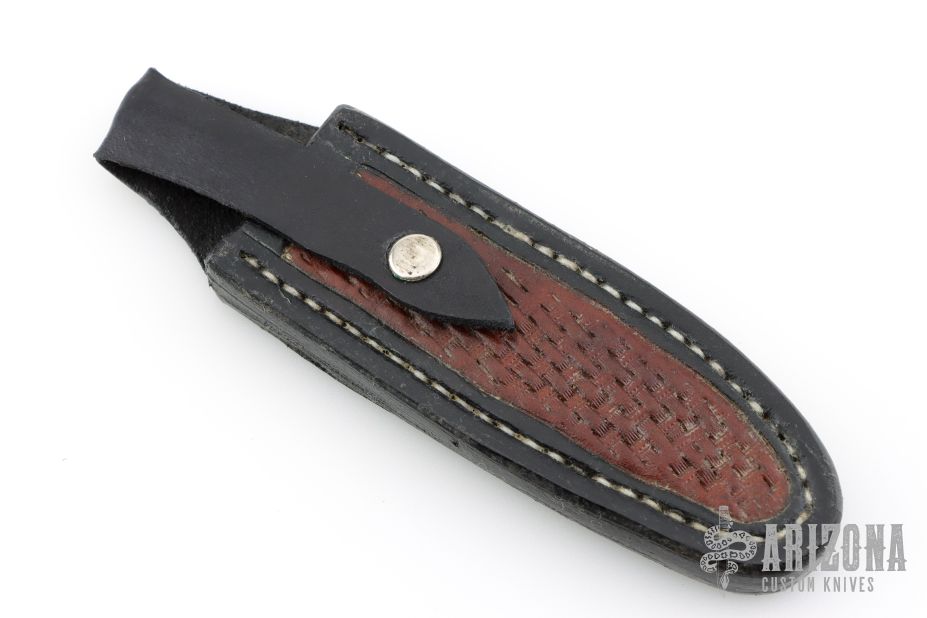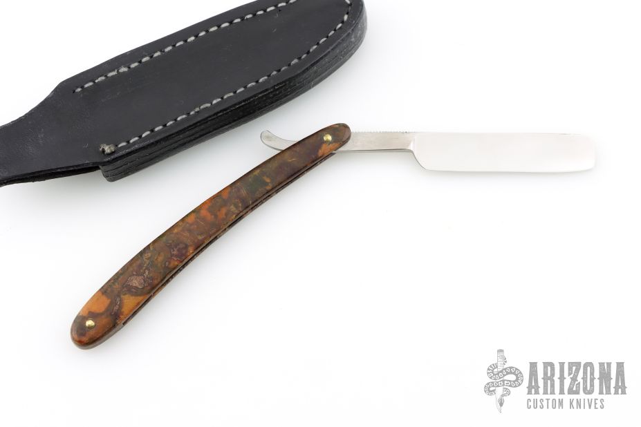 This Straight Razor by Matt Cook features a high satin finished hollow ground blade with notched thumbrest. The handle is made of antique 85+ year old rag micarta with brass pins. Comes with a hand tooled black/brown leather sheath. Excellent condition.