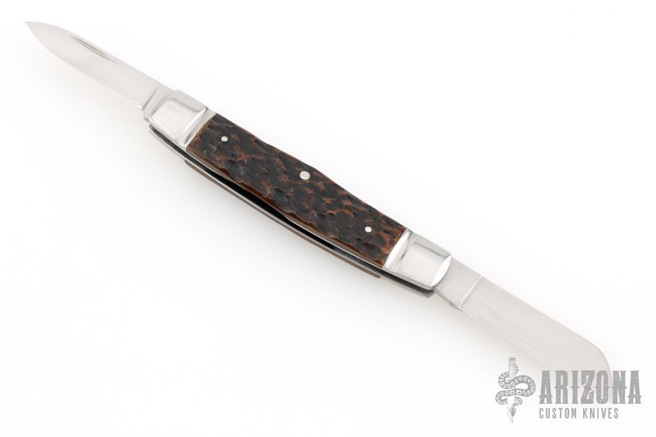 This swell center slipjoint by Ohta features hand-rubbed satin finished blades with nail nicks. The handle has fluted stainless steel bolsters, integral stainless steel liners, and jigged bone covers with a stainless steel escutcheon and springs. Comes with a zippered case. Has half-stops, flush in all positions. Comes in a small leather slip. Has some light scratches, otherwise Excellent Condition.