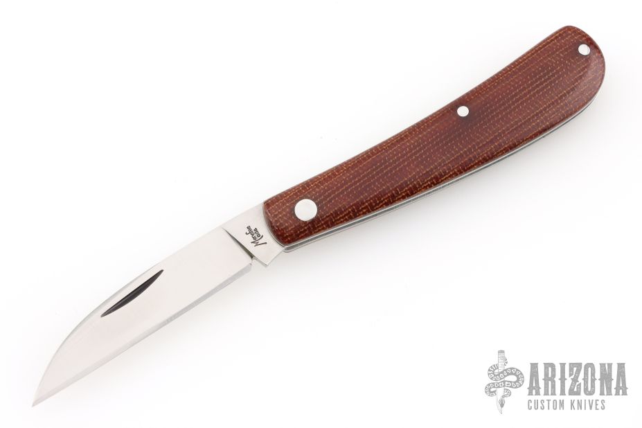 This knife by Rick Menefee features a satin finished wharncliffe blade with nail nick. Has half stop, flush in all positions. The handle has brown canvas micarta covers, and stainless steel spring, and liners. Excellent condition.