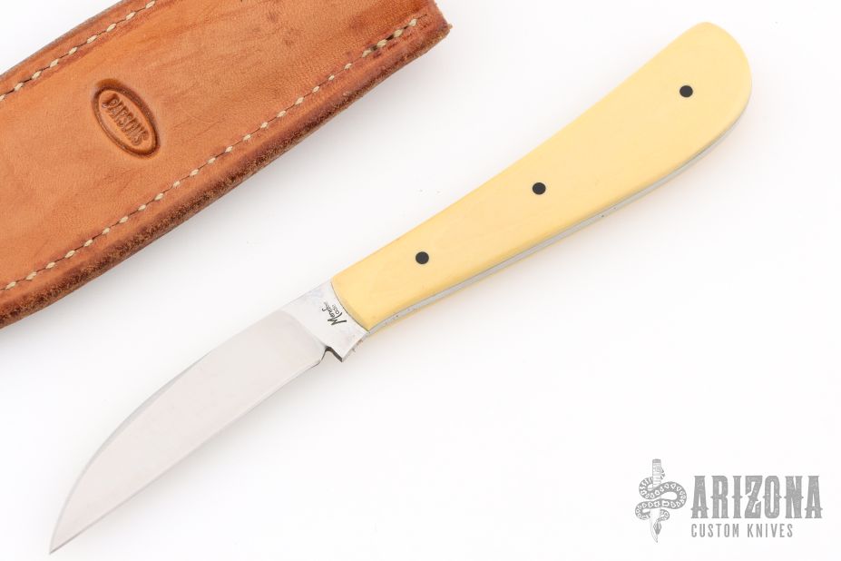 This Desk Knife by Rick Menefee features a satin finished sheepsfoot blade with .088" blade stock and .49" blade depth. The handle has pinned Westinghouse micarta scales over full tang construction. Comes in a leather sheath. Has some light scuffs, excellent condition otherwise.
