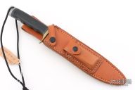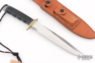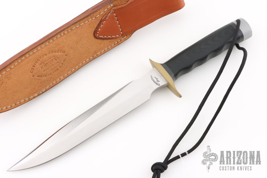 This Model 1-8 Style Fighter by Greg Covington has a satin finished clip point blade with a sharpened top edge, .262" blade stock and 1.250" blade depth, hidden tang construction. The handle has a bead blasted brass guard and a bead blasted aluminum butt with lanyard hole, black linen micarta grip with finger grooves, grey/black spacers. Comes with original brown leather sheath. New from maker.