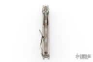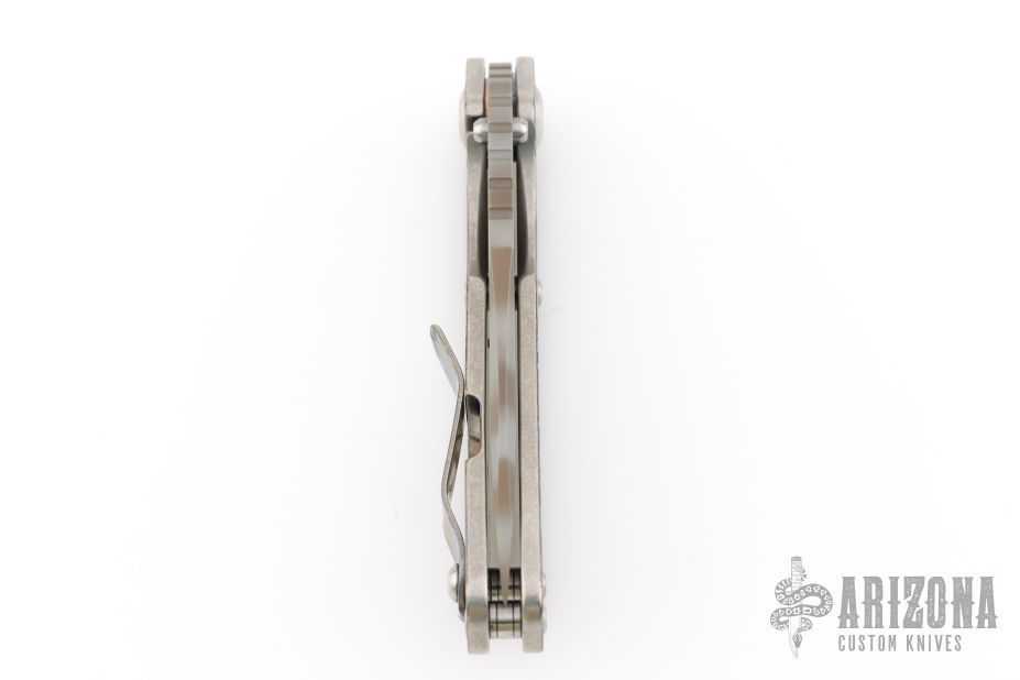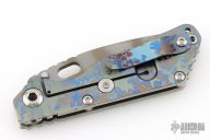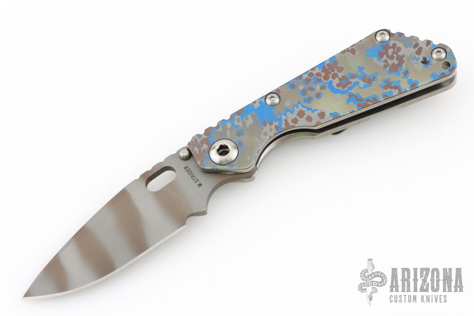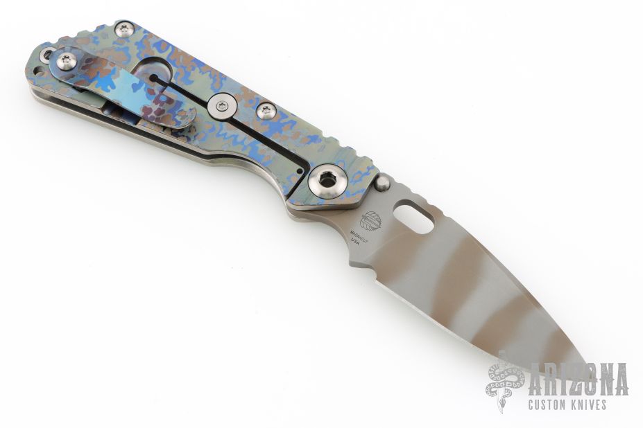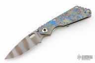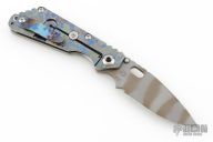 This Mick Strider Performance Series SMF framelock folder features a tiger striped drop point blade with thumbhole and notched thumbrest. The handle has a laser engraved titanium frame with titanium clip, tip up carry. Jimping on blade spine. Includes Hinderer "Lock Bar Stabilizer" for maximum reverse lock retention. Nice detent, lockup and blade seating. New from maker at the 2025 CCKS.