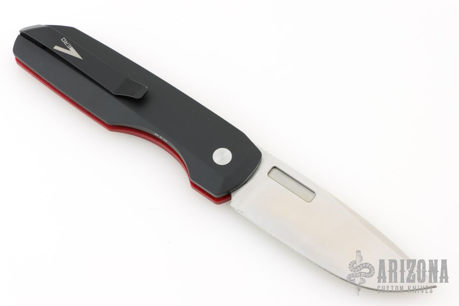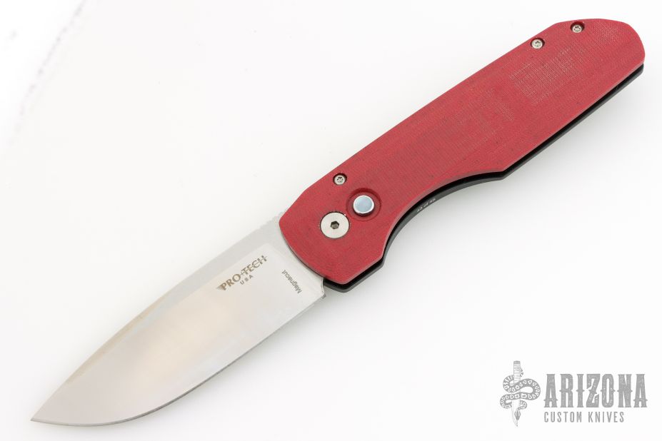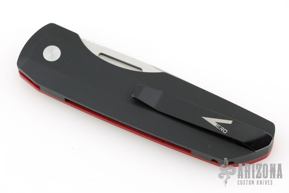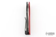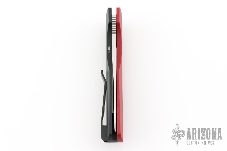 This Synapse LTD by Pro-Tech is a Vero Engineering design. It has a satin finished blade with notched thumbrest. The handle has a red linen micarta and black aluminum frame, mother-of-pearl push button, tip up black titanium clip with hidden screws. Comes with original box and papers. #43 of 45. New from maker at the 2025 CCKS.