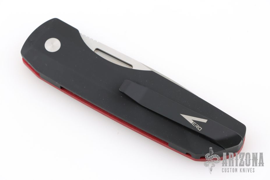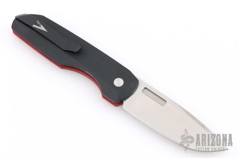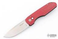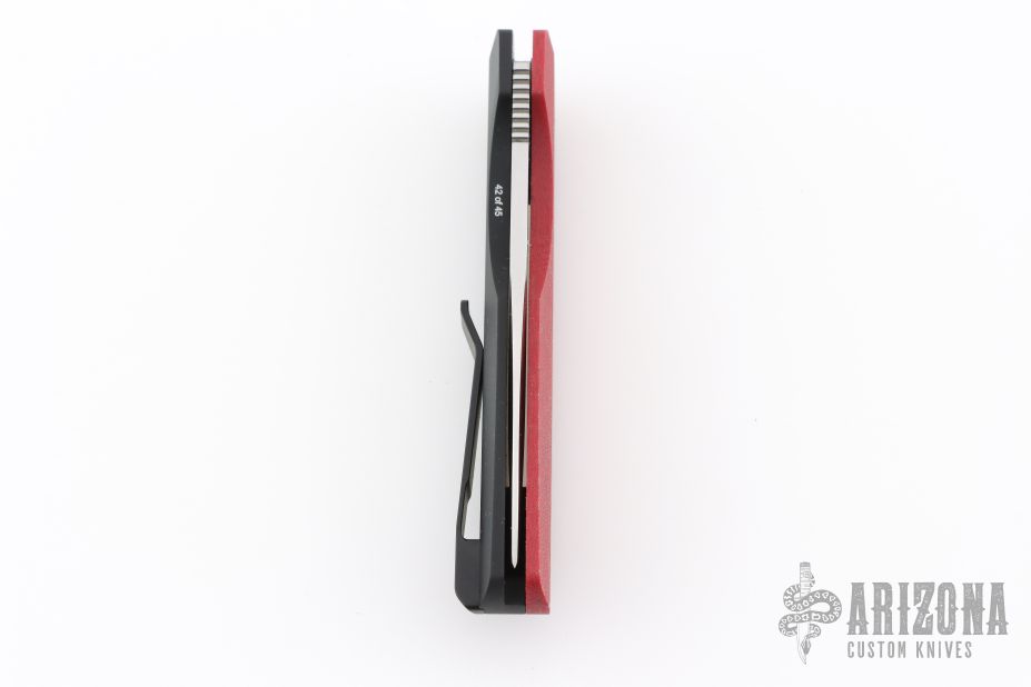 This Synapse LTD by Pro-Tech is a Vero Engineering design. It has a satin finished blade with notched thumbrest. The handle has a red linen micarta and black aluminum frame, mother-of-pearl push button, tip up black titanium clip with hidden screws. Comes with original box and papers. #42 of 45. New from maker at the 2025 CCKS.