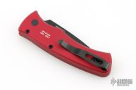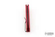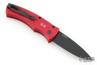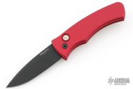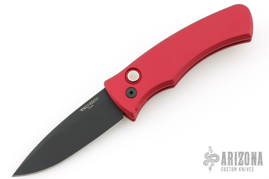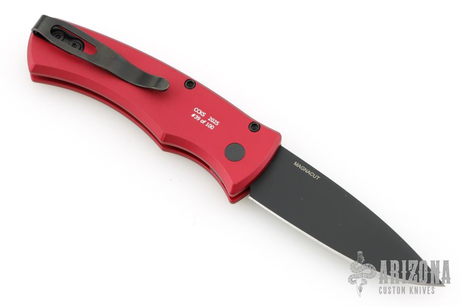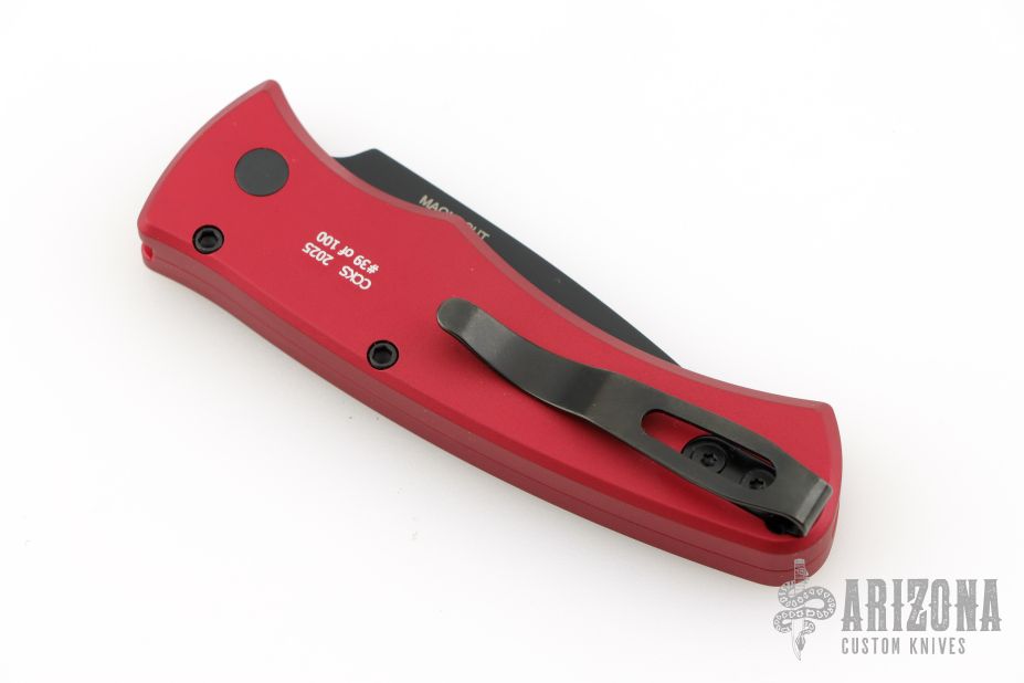 This Duke by Pro-tech features a black DLC drop point blade. The handle has a red aluminum frame with a black tip-up steel pocket clip, black lip pearl button. Includes the original box and papers. New from maker at the 2025 CCKS.