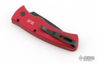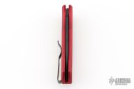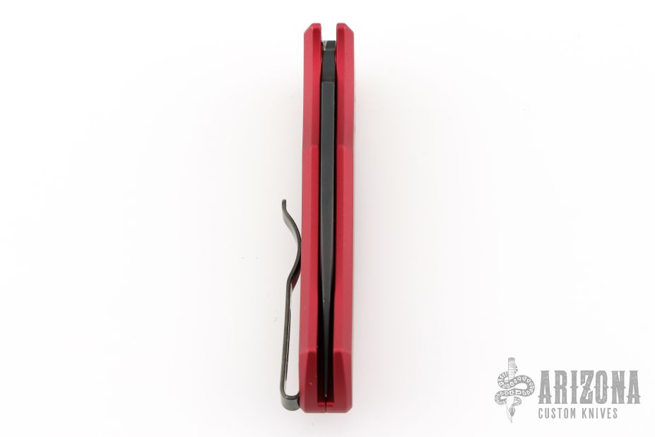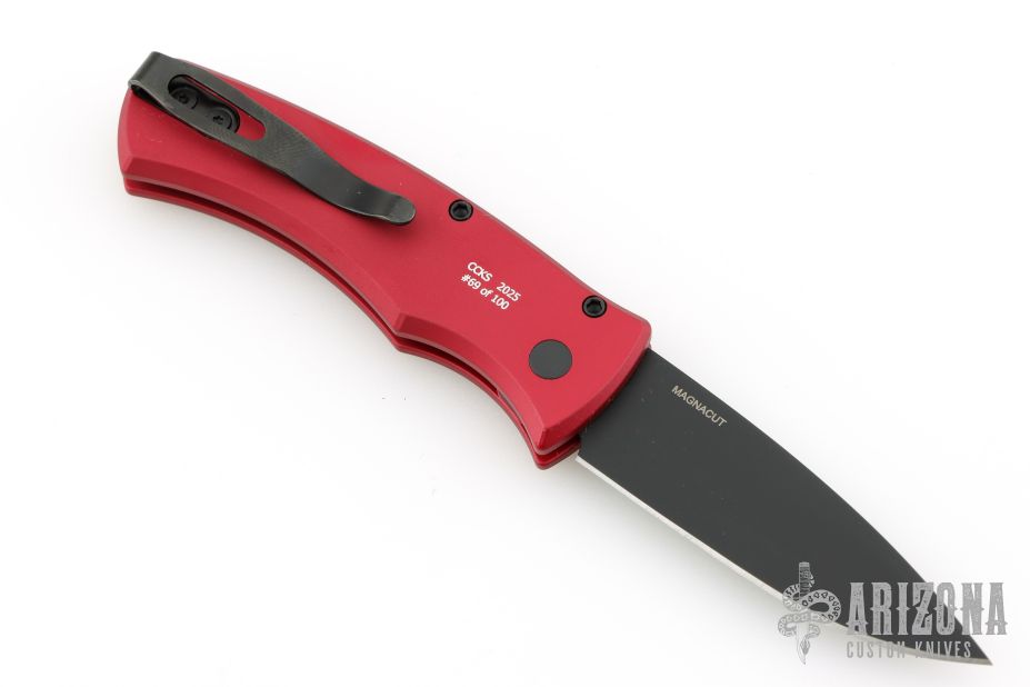This Duke by Pro-tech features a black DLC drop point blade. The handle has a red aluminum frame with a black tip-up steel pocket clip, black lip pearl button. Includes the original box and papers. New from maker at the 2025 CCKS.