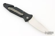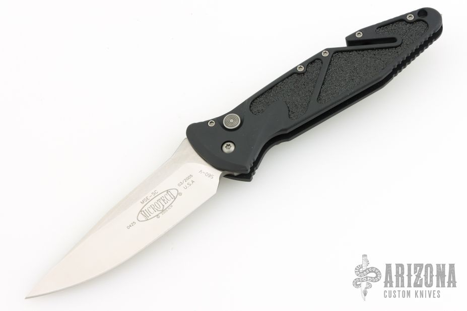 This knife by Microtech features a satin finished blade with black handle. Anti-slip grip insert. Elevated milled thumbrest. Glass breaker. With blade closed the cut-out in the handle serves as a seat belt cutter. Milled top and bottom rear of tapered handle. Plunge lock slide safety. Constant torsion spring open/close action. Comes with original box, nylon sheath and papers. Dated 03/2005. S/N 0425. Excellent condition.