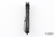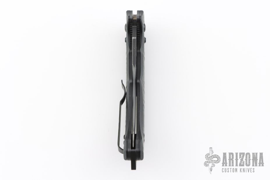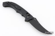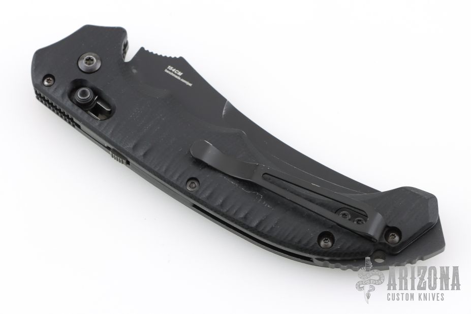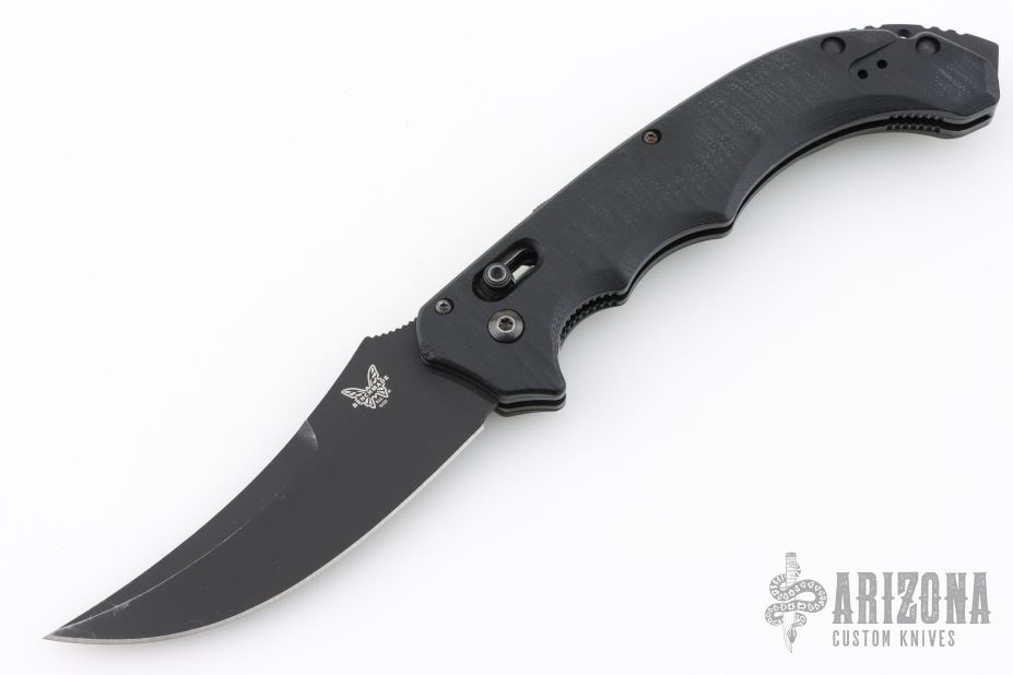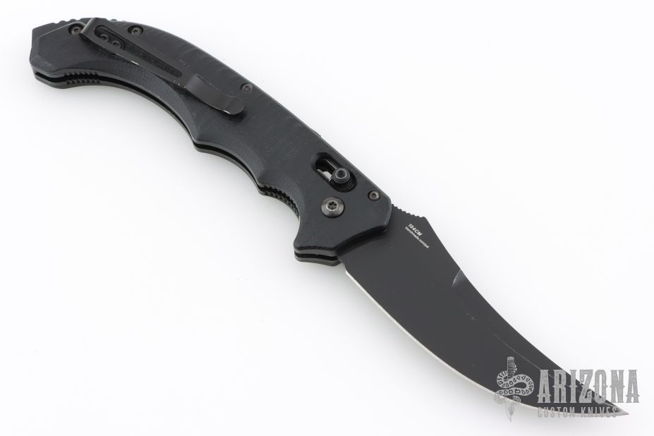 Well-balanced, symmetrical, eye-catching, The Bedlam has a black coated 154CM blade that is released with the AXIS locking button.  Safety on top of knife. Sculpted black G10 handle fits comfortably and securely. Reversible tip up black clip. Has some scuffs and scratches, otherwise good condition.