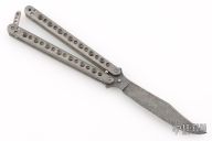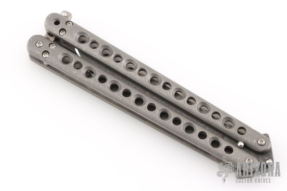 This Balisong by Journeyman Smith Craig Camerer features a stonewashed blade with false top edge. The handles are stonewashed titanium with matching T-latch. Rides on bearings, very smooth. Locks up tight in both position. Excellent condition.