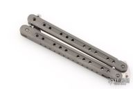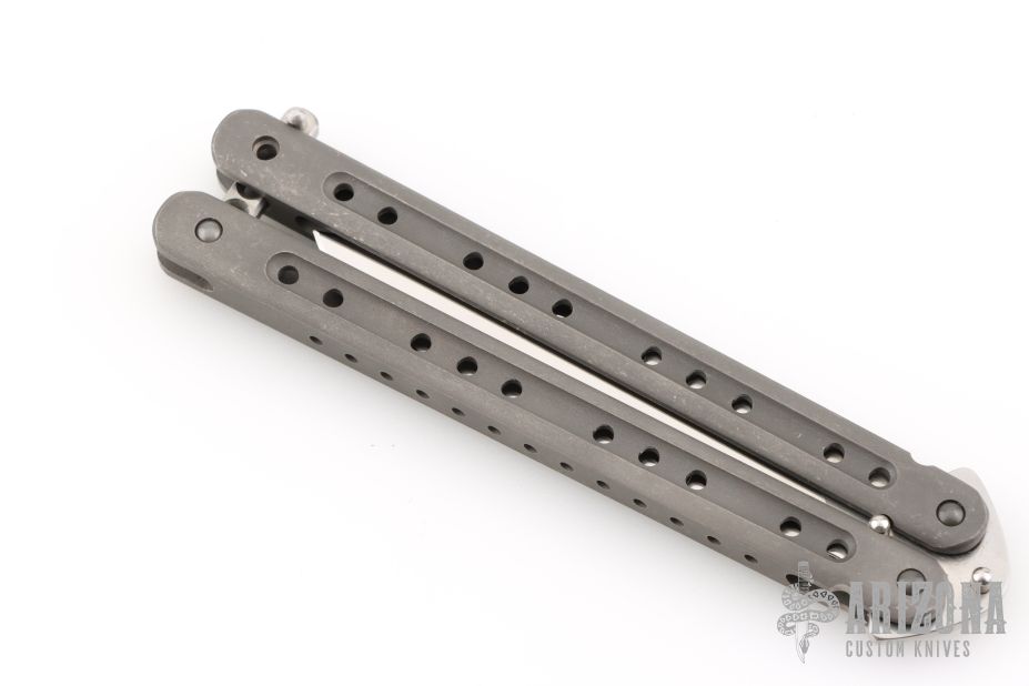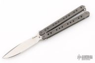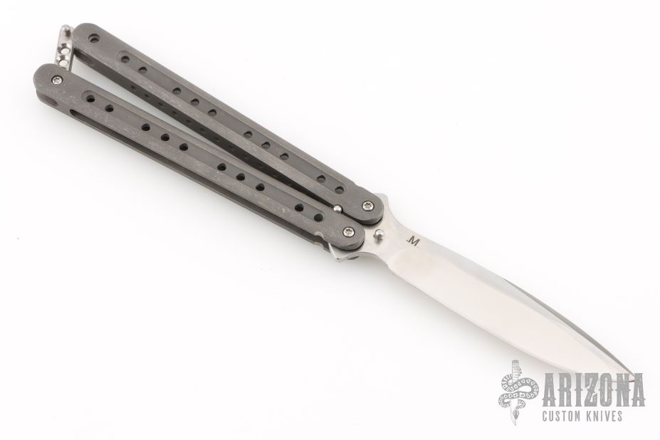 This M-Tech Balisong by Journeyman Smith Craig Camerer features a satin finished blade with false top edge. The handles are stonewashed chanel construction titanium with a titanium T-latch. Rides on bearings, very smooth. Locks up tight in both position. Excellent condition.