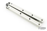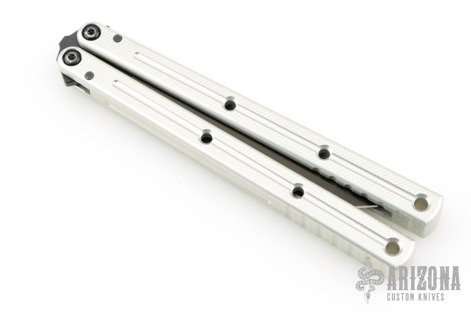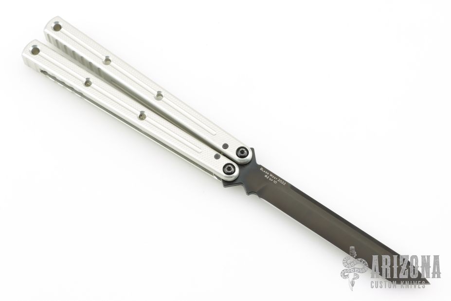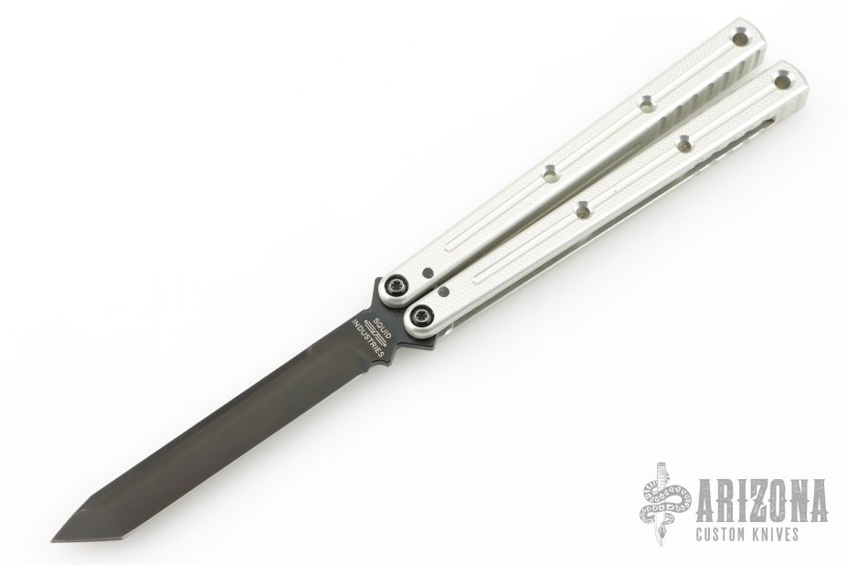This Krake Raken V3 model (formerly known as the Kraken), has a silver finished 7075 aluminum alloy handle and a modified tanto blade with a long swedge. The blade has a black DLC coating for an inked finish.