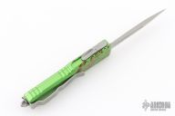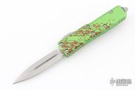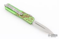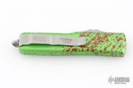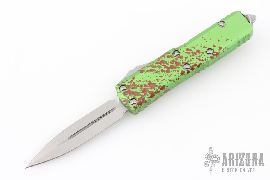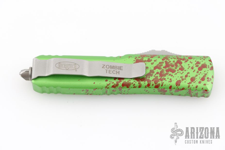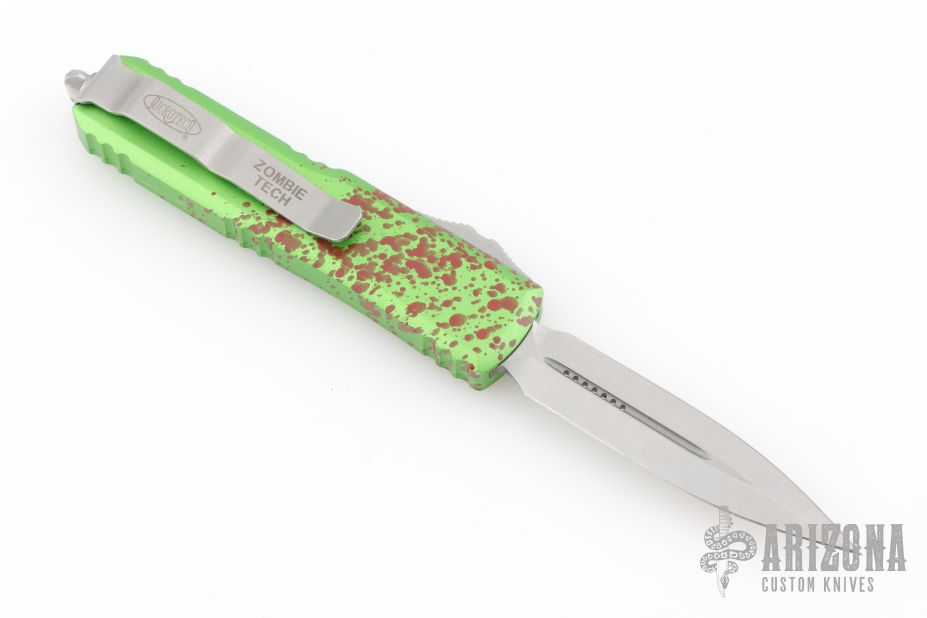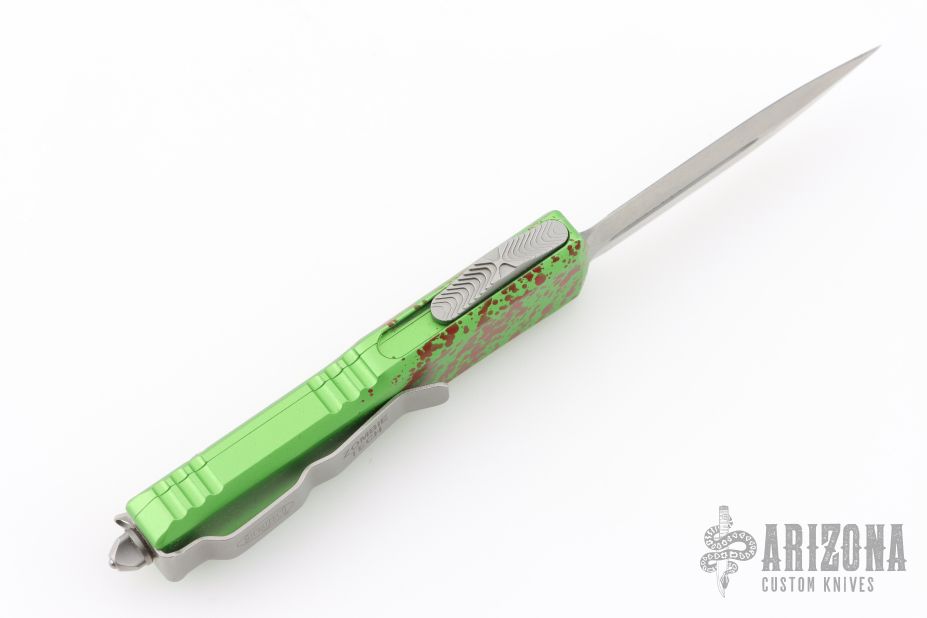 This UTX-85 OTF automatic by Microtech knives features a D/E stonewashed double-edged blade with a standard edge, and a green/red splatter aluminum handle with blasted hardware, tip down carry. Glass breaker. Clip marked Zombietech. Comes with original box and papers. Has a couple light scuffs on the clip, otherwise excellent condition.