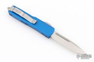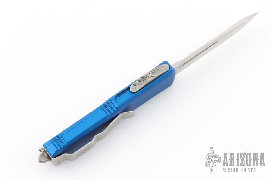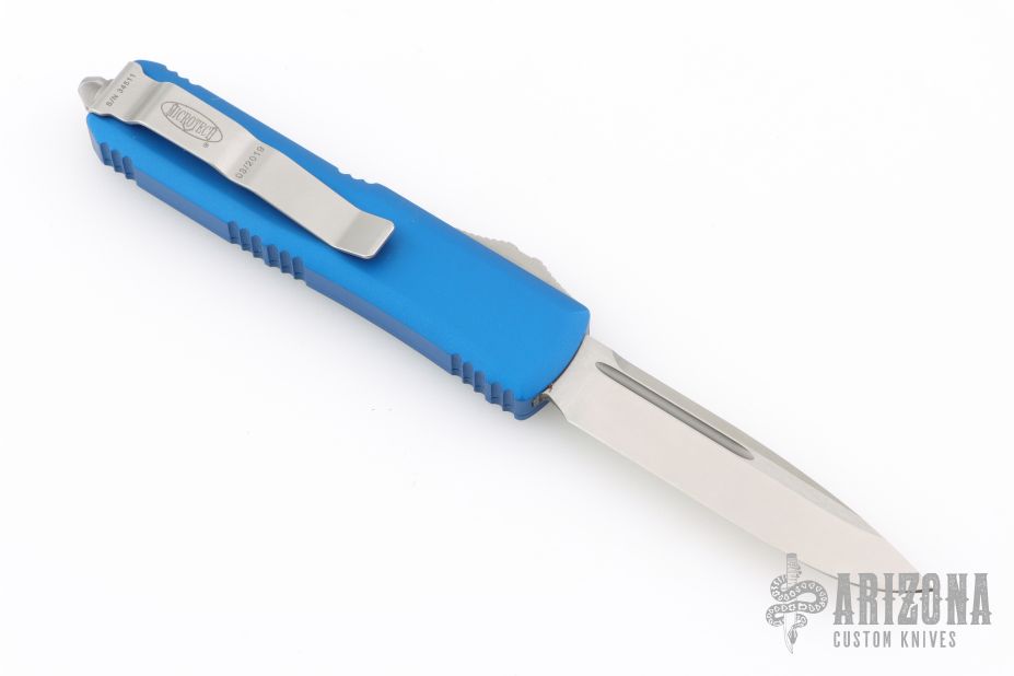 This UTX-85 by Microtech Knives features a satin finished single edged blade with fullers. The handle has a blue aluminum frame with blasted stainless steel hardware and tip down clip. Dated 03/2019 and #34511. Comes with original box. Excellent Condition.