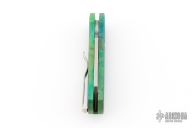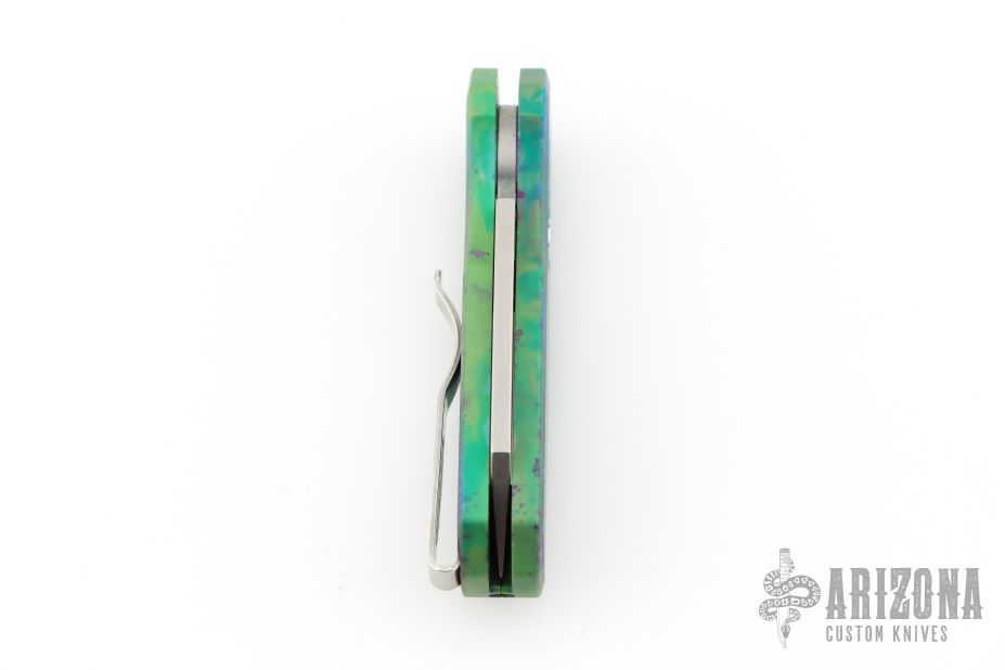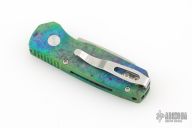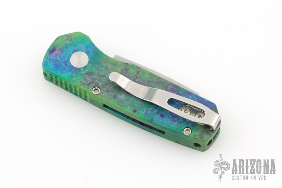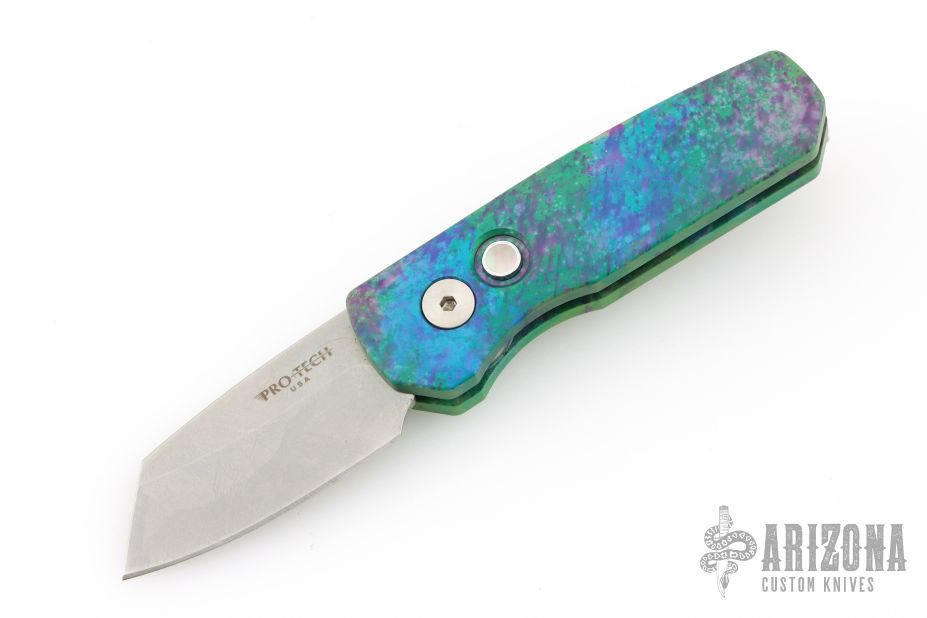 This Runt by Pro-Tech features a stonewashed Magnacut blade. The handle features a "Northern Lights" aluminum frame with milled thumbrest, a black lip pearl push button and a stainless steel tip up pocket clip. Comes with original box and papers. Excellent condition.