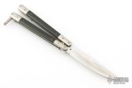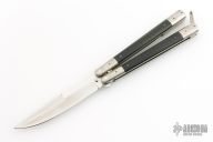 This Balisong by Pinoy Knives (Matt Cook) features a satin finished blade with false top edge. The handles have orange peel finished titanium bolsters, black canvas micarta inlays, satin titanium liners, orange peel finished titanium backspacer, titanium t-latch. Has a few light scratches, otherwise excellent condition. Comes with original wooden box.