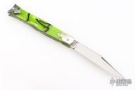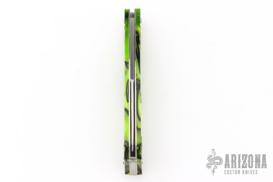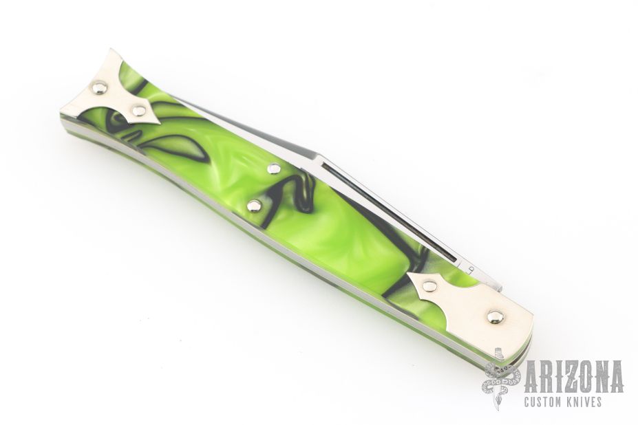 This knife by Great Eastern Cutlery features a satin polished blade with a single nail nick. The handle has nickel silver bolsters, nickel silver liners, Kryptonite Acrylic covers. Has half-stop. Excellent condition.