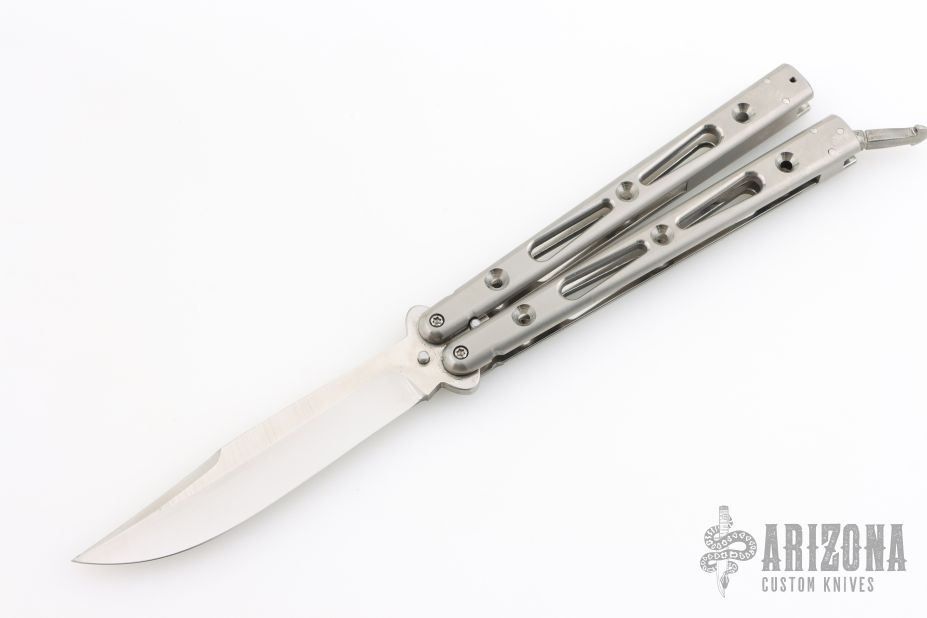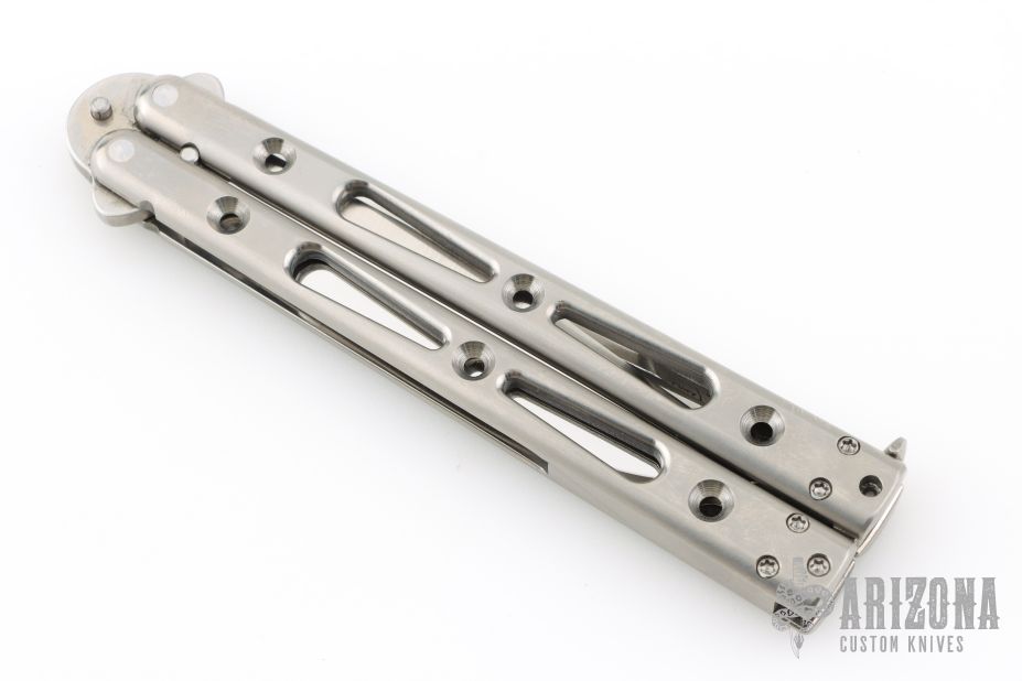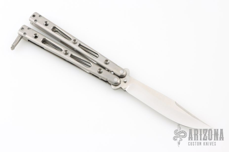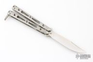This Dragonfly balisong by Matt Cook features a satin finished blade with false top edge. The handle has satin finished titanium handles with matching T-latch. Has a couple very light scratches, otherwise excellent condition. Comes with original wooden box.
