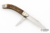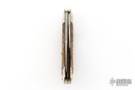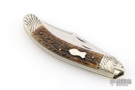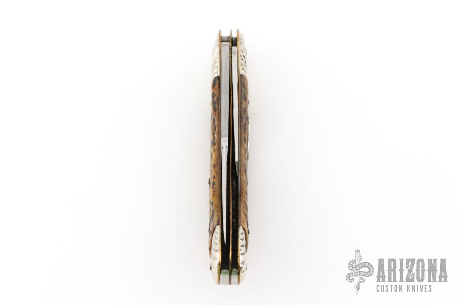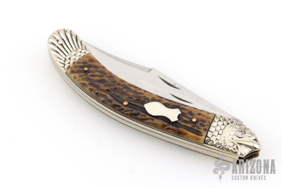 This knife features two mirror polished blades, both with single nail nicks.  The handle has carved nickel silver bolsters, jigged bone covers, brass liners and steel backsprings.  We cannot identify the maker/manufacturer of the knife. If anyone recognizes them, let us know.  Has scuffs/scratches otherwise excellent condition.