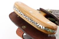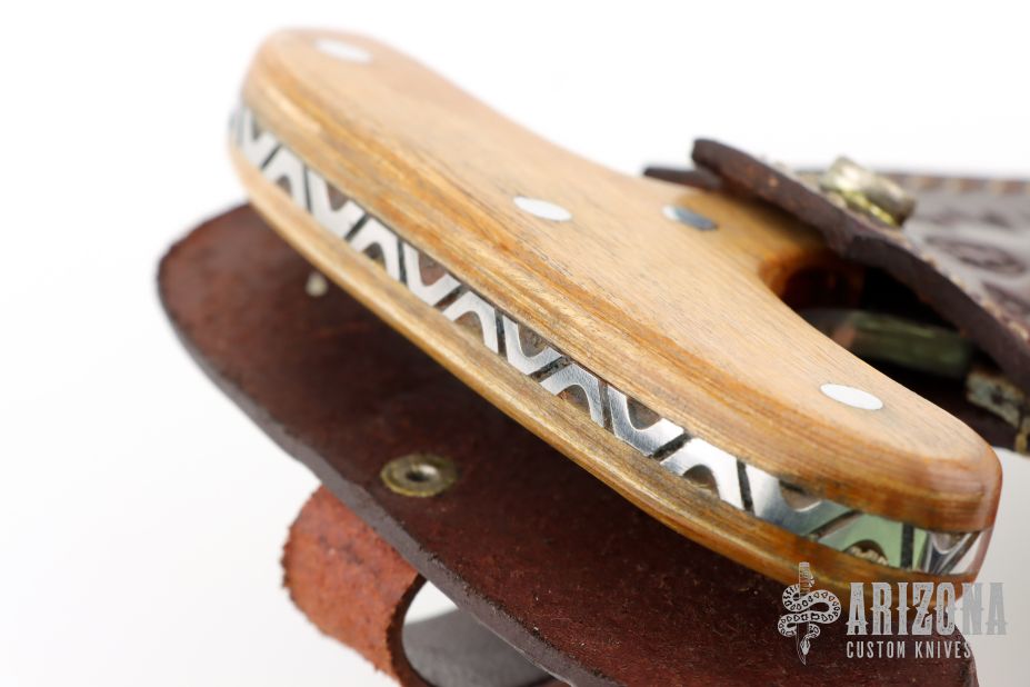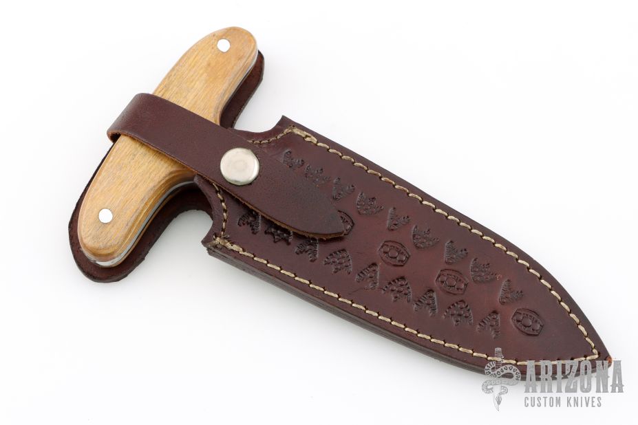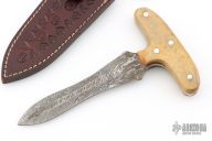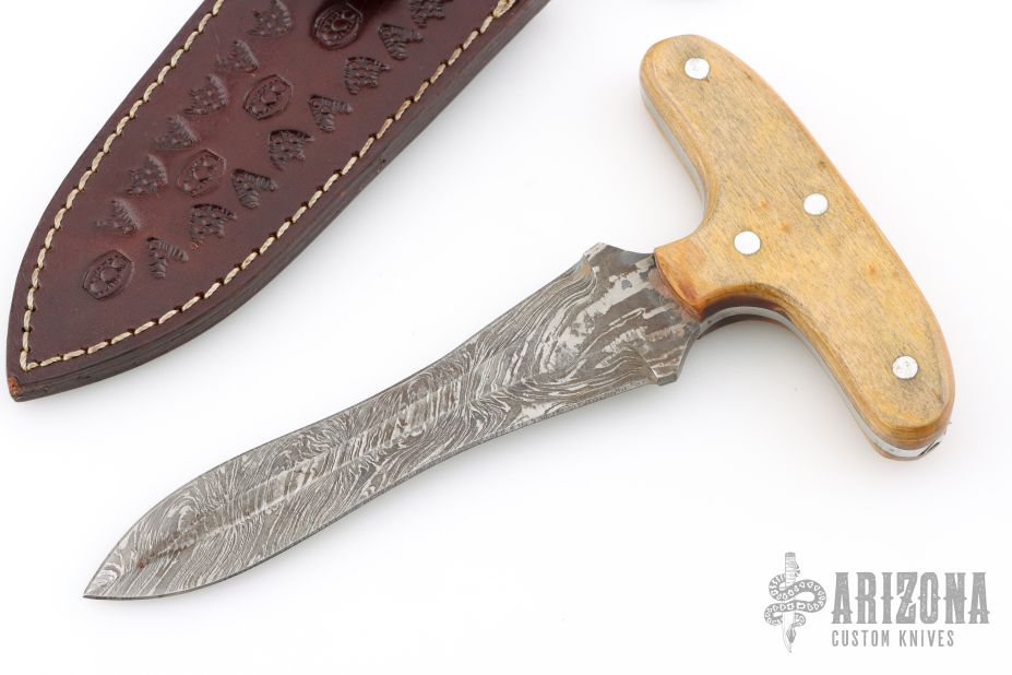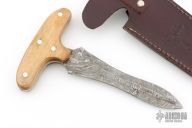 This Push Dagger from Cutlery Salvation features a Damascus dagger style blade with a full tang construction.  .215"Blade Stock.  1.502" blade Depth.  The handle has wood scales.  Includes a brown leather sheath.  Oxidation is visible on the blade otherwise the knife is in good condition.