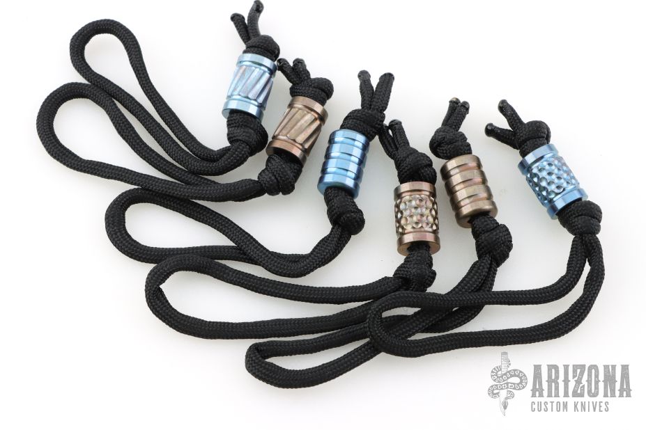 Titanium lanyard beads are perfect to tie on your folding knife, small fixed blade or you can use them as zipper pulls.  We make them in house from 1/2" dia Grade 5 Titanium, which make them super lightweight and durable!