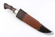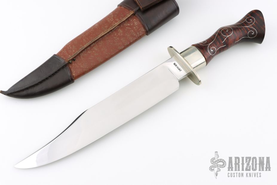 This Southwestern Combat Bowie by Journeyman Smith WR Hurt features a mirror polished clip point blade with false top edge, .252" blade stock and 1.822" blade depth, hidden tang construction. The handle has a nickel silver guard with a curly maple grip that has silver wire inlays, very comfortable in the hand. Comes with a leather covered wooden scabbard with belt loop. Comes with nylon zippered case. Has a few light scratches, otherwise excellent condition. Has JS stamp (Journeyman Smith) Comes with some letters from the maker as well.