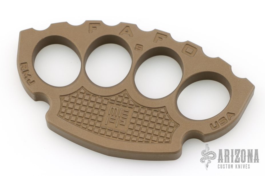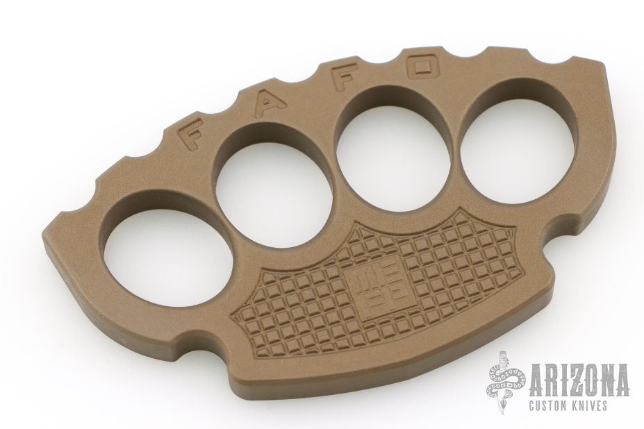 CNC Milled Aluminum Aluminum/Bronze Cerakote finished Lil Buster knuckles from Ryan Johnson at Gold Point Forge. Has Monkey Edge Frag Pattern. Comes in original pouch. Excellent condition.