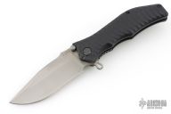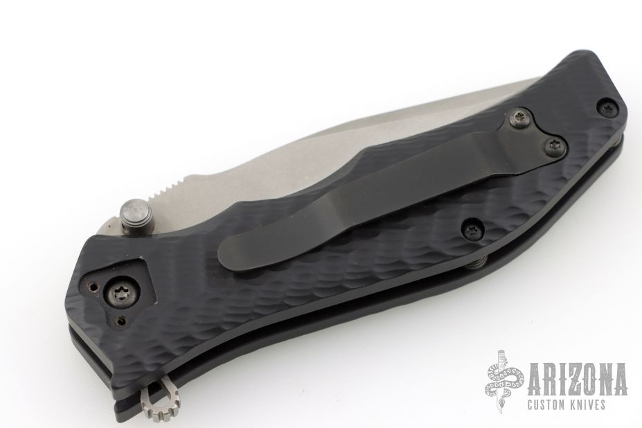 This Gunhammer Torpedo is a Darrel Ralph Design Executed by HTM Knifes. It features a tumble finished drop point blade with swedge, notched thumb ramp, dual thumb studs and flipper. The handle is comprised of a black anodized and machined aluminum frame over nested titanium lock bar and barrel spacers. Black coated steel clip is reversible for tip up or tip down right hand carry. Includes original padded zipper case. Excellent condition.