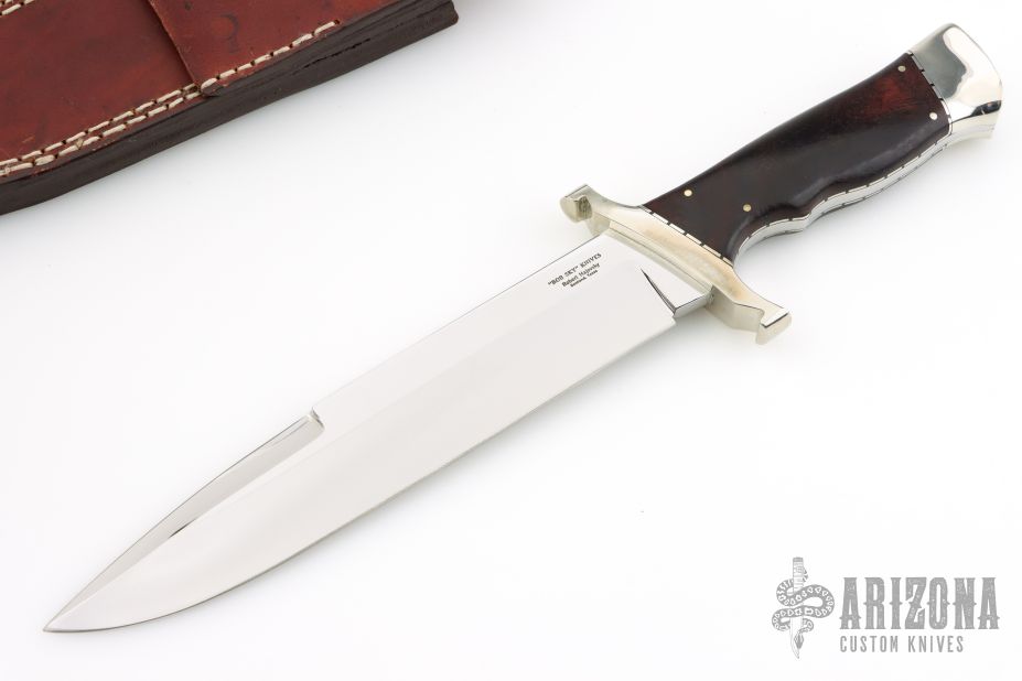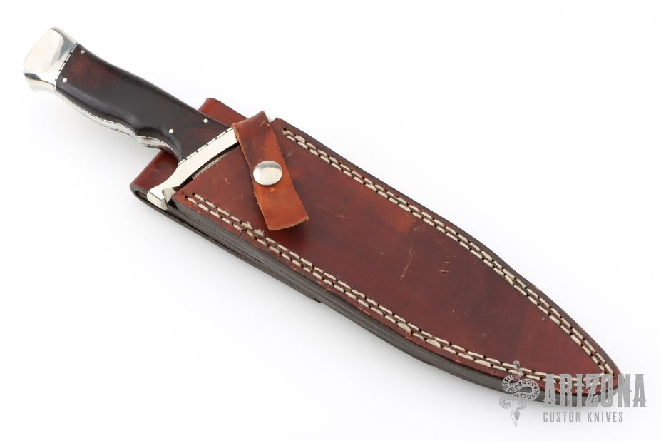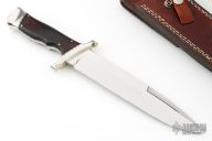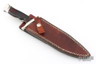 This knife by Bob Sky features a mirror finished spear point blade with sharpened top edge, .249" blade stock and 1.496" blade depth, full tapered tang construction. The handle has nickel silver guard and rear bolsters, dark wood scales, fileworked nickle silver liners and pins. Comes with a brown leather sheath. Excellent condition.