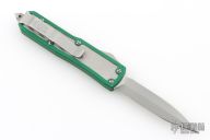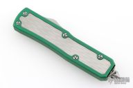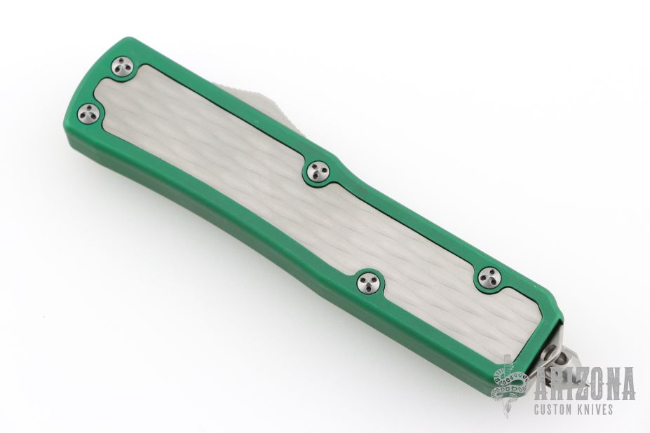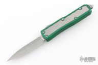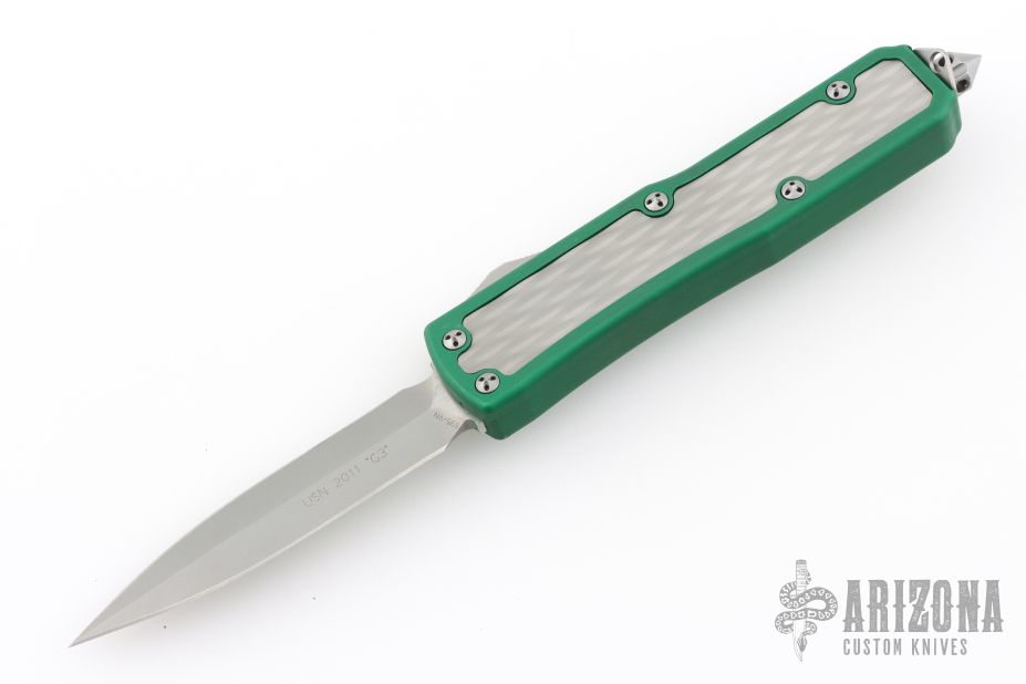 This Daytona OTF automatic features a D/E bead blast blade with a standard edge, and a green handle with bubble inlays. Tip up pocket clip and Glass breaker. Marked "USN 2011 G3" on blade. Comes in a Microtech drawstring pouch. Has some light scuffs and scratches, great condition otherwise.