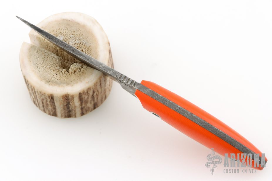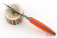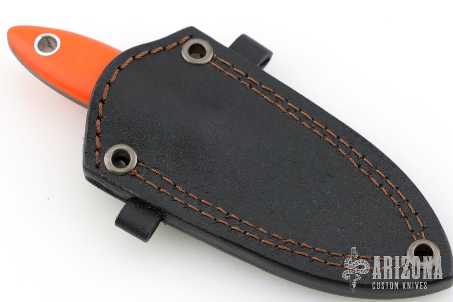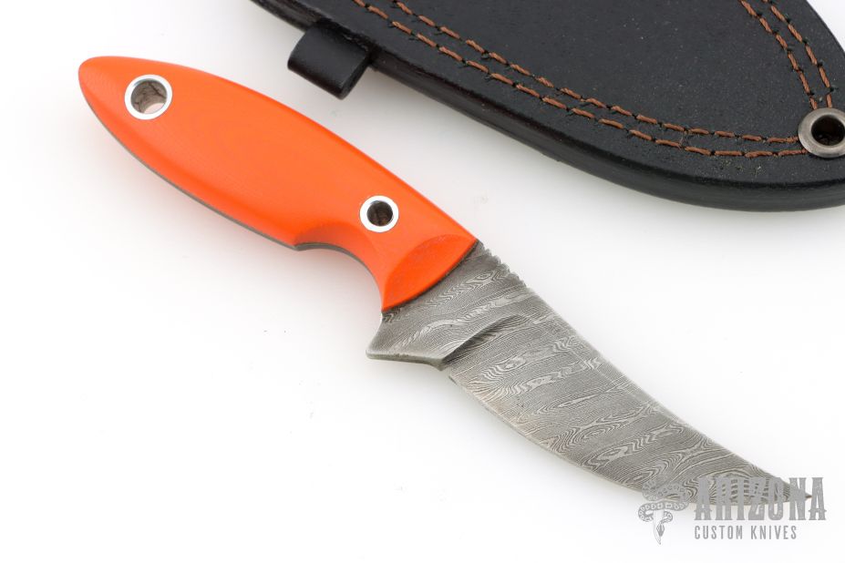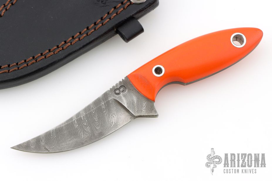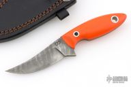 This Neck Knife from Olamic Cutlery features a Damascus blade with .123" blade depth and .78" blade stock, full tang construction. The handle has orange G10 scales. Includes leather neck sheath. Excellent condition.