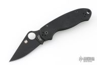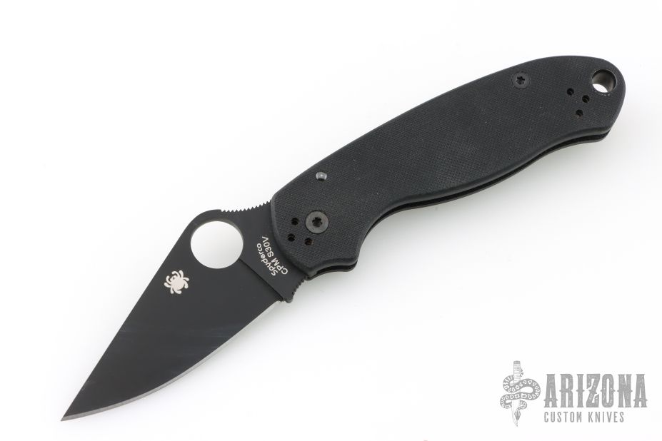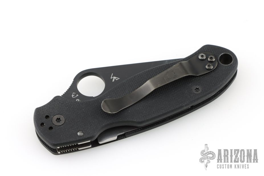 This Paramilitary 3 Linerlock Folder from Spyderco has a black finished clip point blade with thumbhole and notched thumb rest. Handle has black G-10 scales with nested stainless steel liners and black stainless steel 4-way reversible clip. Has scuffs on the blade, otherwise good condition.
