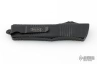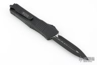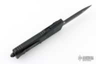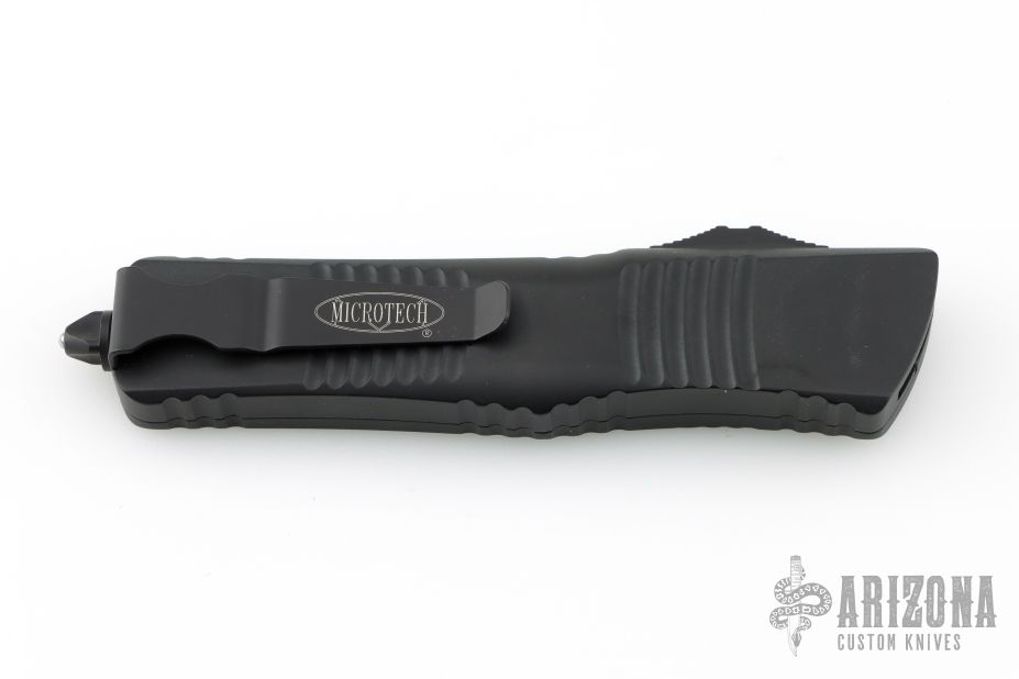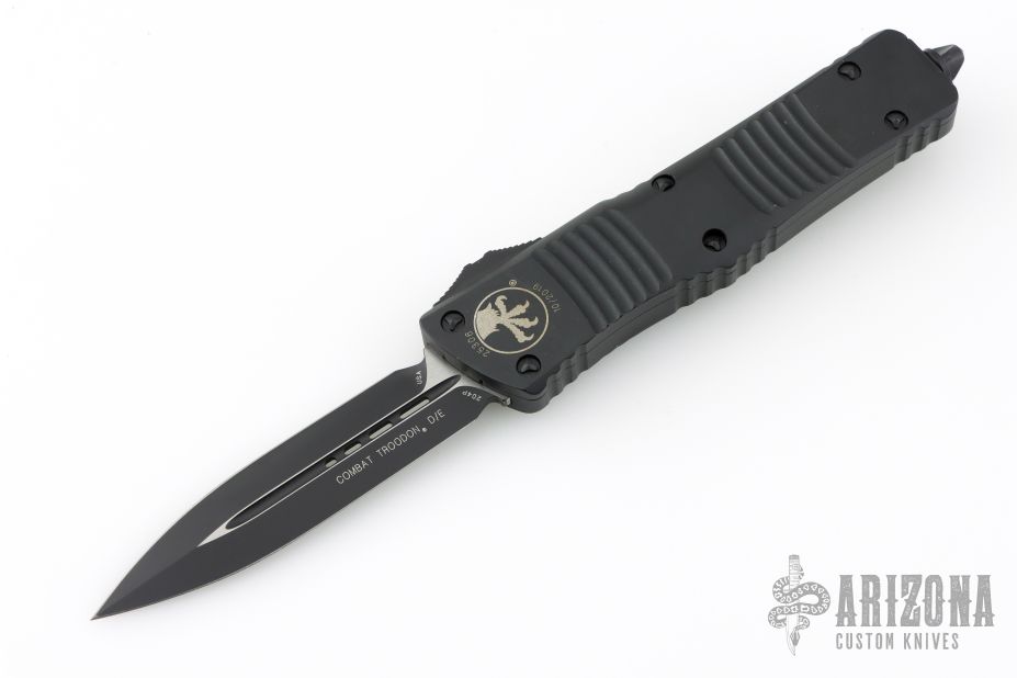 This Combat Troodon OTF automatic by Microtech knives features a black double-edged double blade, and a black aluminum handle with black hardware, tip down carry. Glass breaker. S/N 25306. Dated 10/2019. Comes with original box and papers. Excellent condition.
