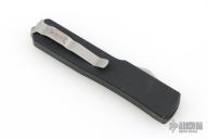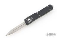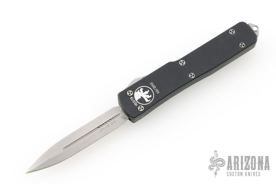 This UTX-70 OTF automatic features a bead blast double edge blade with a standard edge and a black anodized aluminum handle. Serial number 18919 and dated 03/2013. Comes with original box, papers, and drawstring pouch. Box says USN 2013. Excellent condition.