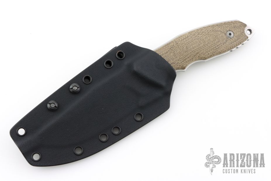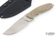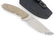 This BRNLY Huck by Lucas Burnley features a tumbled clip point blade with choil, notched thumb ramp, 1.93" blade stock and 1.5" blade depth. The handle is comprised of green micarta scales over full tang construction. Exposed tang pommel with lanyard hole. Includes kydex sheath with clip and original box. Has a couple marks on the blade, otherwise excellent condition.