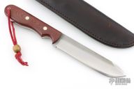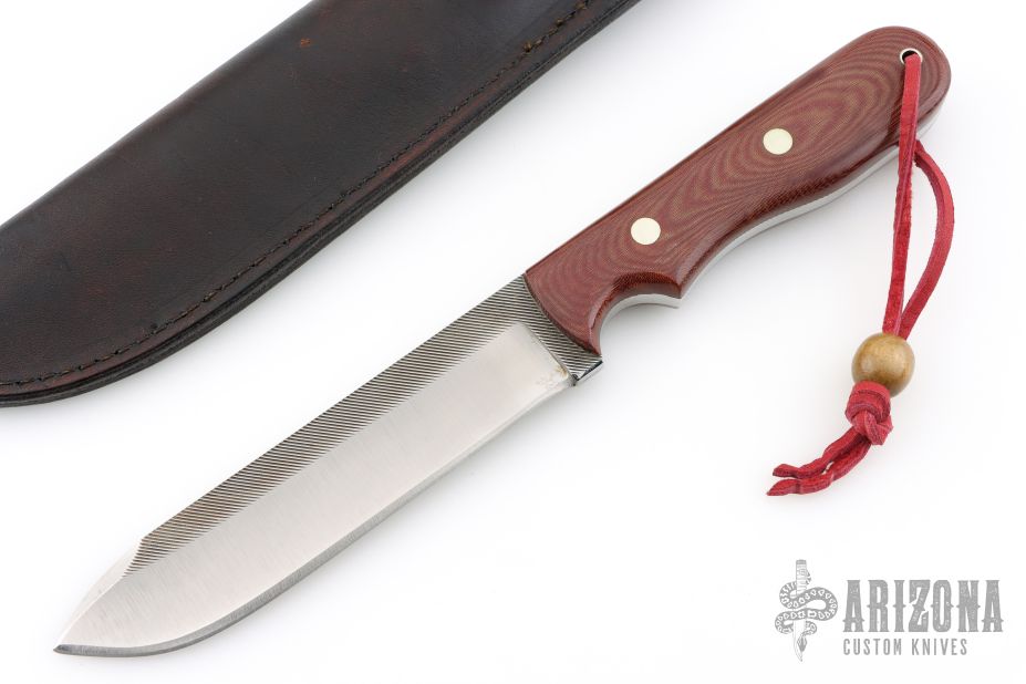 This Bowie by Anza Knives features a clip point blade made from a Nicholson Bastard file, pinned micarta scales, with lanyard hole in pommel, .254" blade thickness and 1.31" blade depth, full tang construction. Comes with a brown leather sheath. Excellent condition.