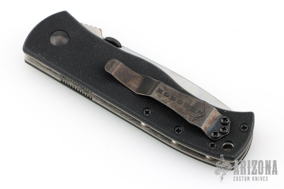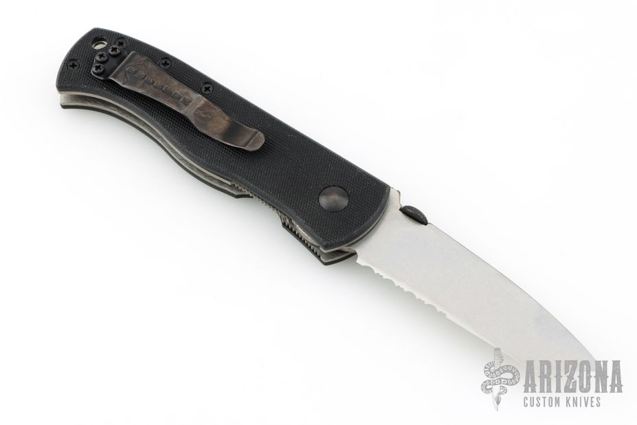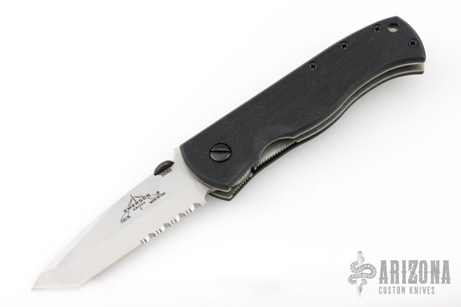 This CQC-7 by Emerson Knives has a satin finished chisel grind tanto partially serrated blade with notched thumbrest and thumbdisc. The handle has textured black G-10 scales with titanium liners, tip up black stainless steel clip. #5046. Comes with an Emerson box and papers. Excellent condition.