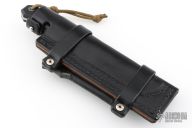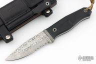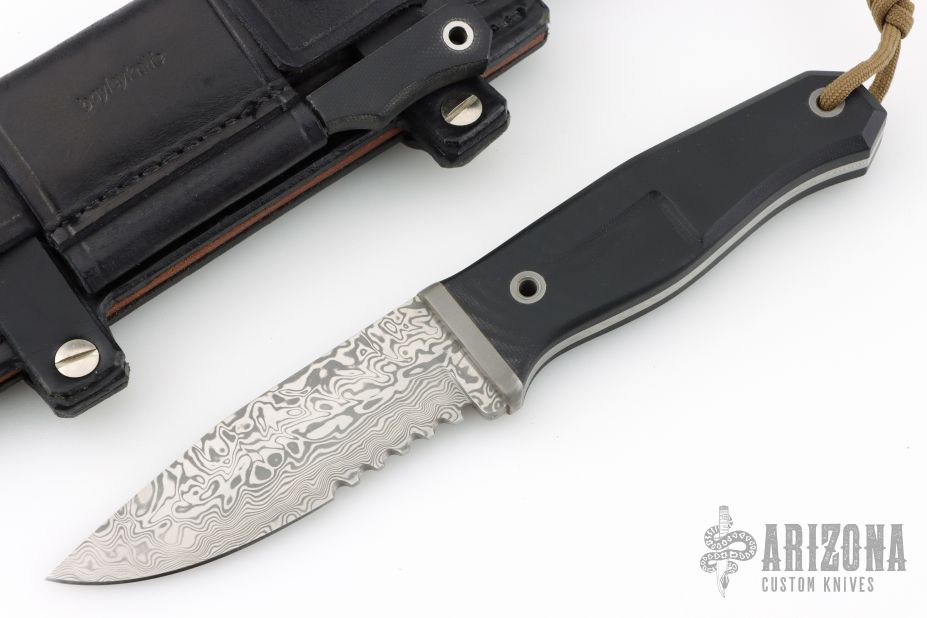 This S4 Survival Knife by Rob Bayley features a Damascus partially serrated blade, .154" blade stock and 1.216" blade depth, full tang construction. The handle has a bead blasted titanium guard and black G-10 scales. Includes a black leather sheath with a matching firesteel. Excellent condition.