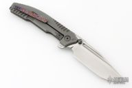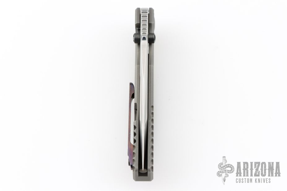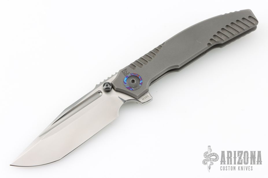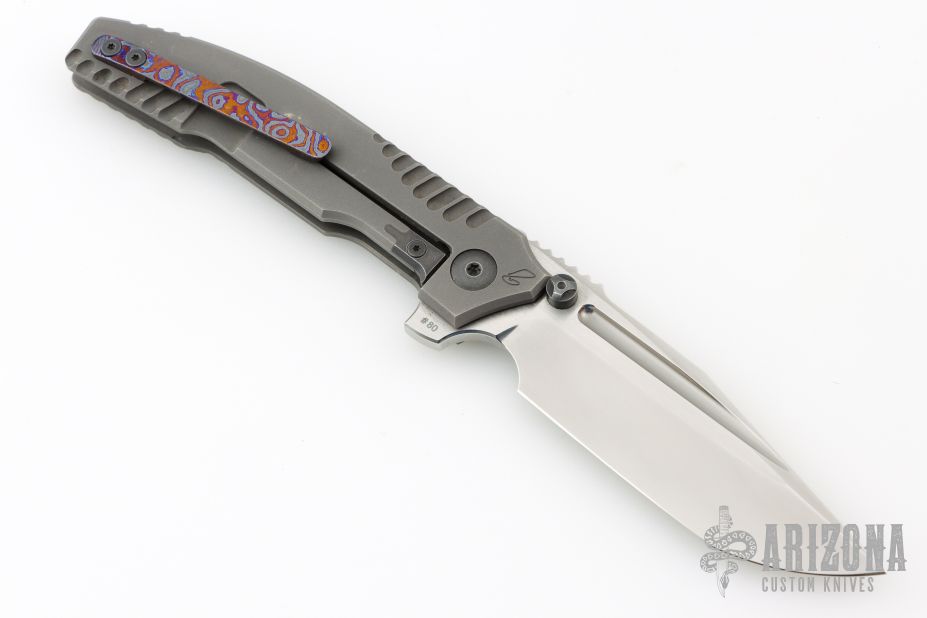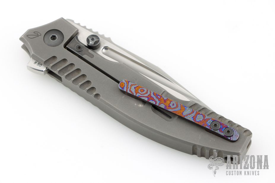 This Snafu 3.0 Integral Flipper by Custom Knife Factory is a Peter Rassenti design, it features a two tone blade with notched thumbrest and flipper. The handle has a bead blasted and anodized titanium frame and tip up clip, timascus pivot collars. Rides on bearings, nice detent, lockup and blade seating. Has a stainless lockface insert. Comes with zippered case, extra hardware and COA. S/N 80. Has some scuffs on the frame, otherwise excellent condition.
