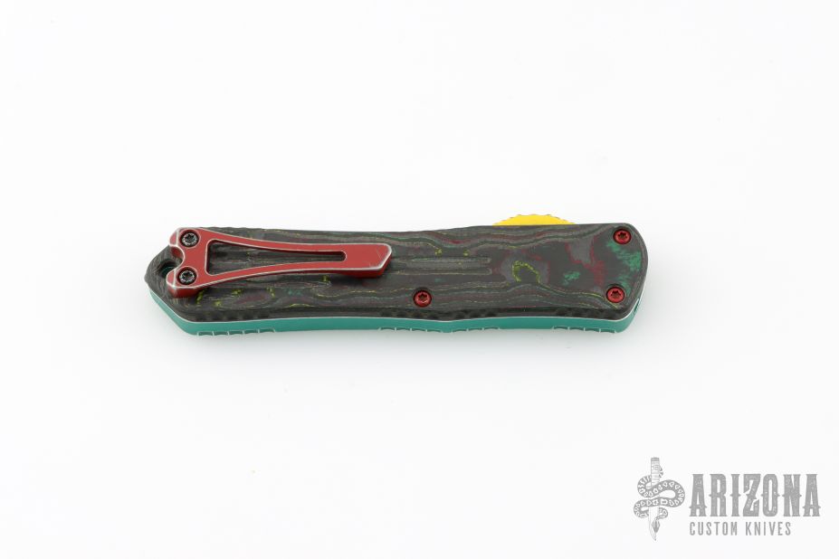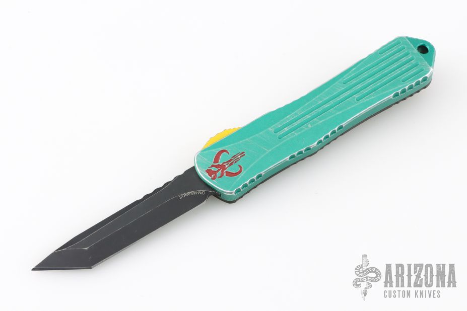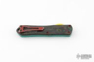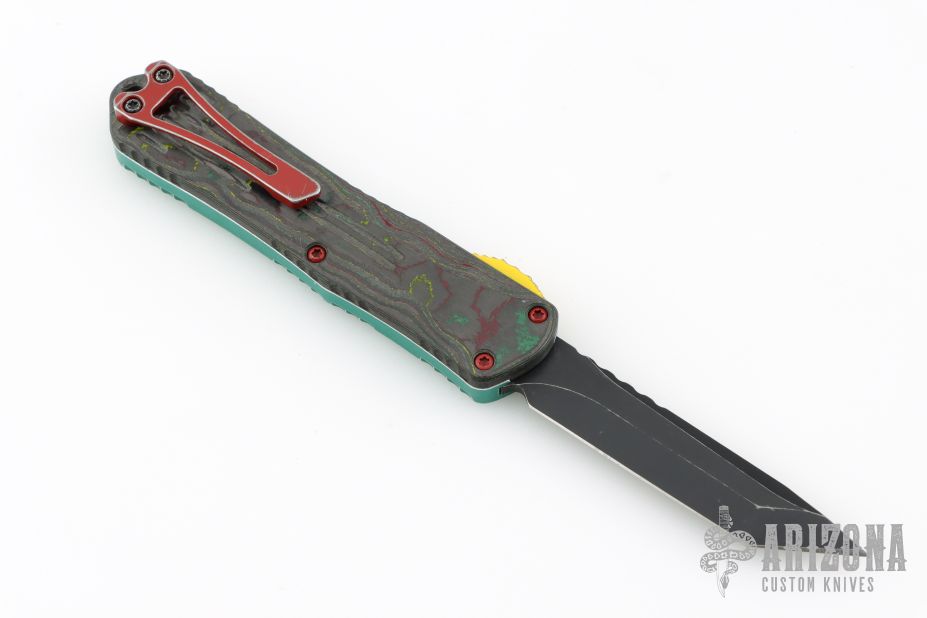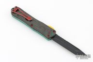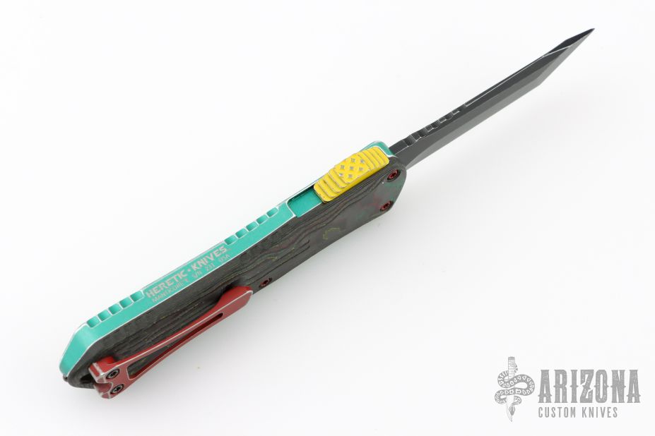 This Manticore-E by Heretic Knives features a battle black coated tanto blade with notched thumbrest. The handle has an aluminum frame with a camo carbon back cover, red stainless steel hardware and tip down clip.  Comes with original box, papers and sample tube of OTF Lube.  S/N 231.  Excellent Condition.