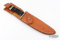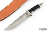 This Mercenary from Shiva Ki features a recurve double edge blade made with Samurai Steel, .284" blade stock and 1.689" blade depth, full tapered tang construction. The handle is comprised of a nickel silver guard and rear bolsters with black horn scales. Includes a brown leather sheath with belt loop. Has some light scratches, otherwise excellent condition.
