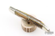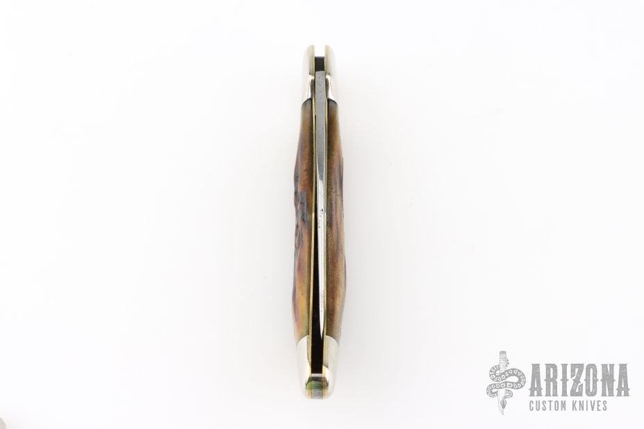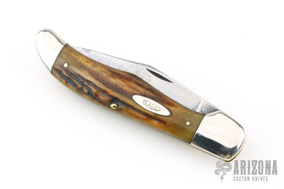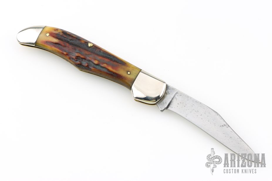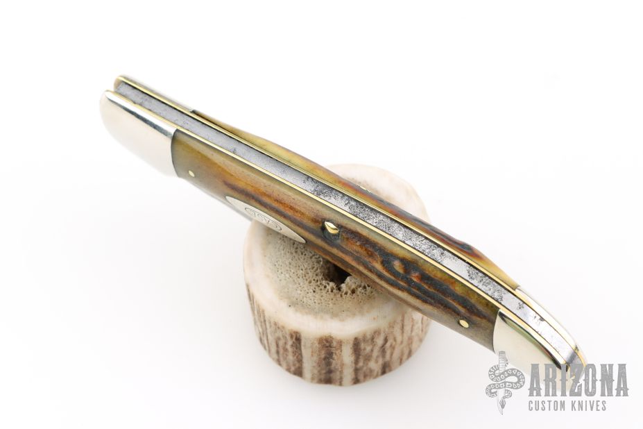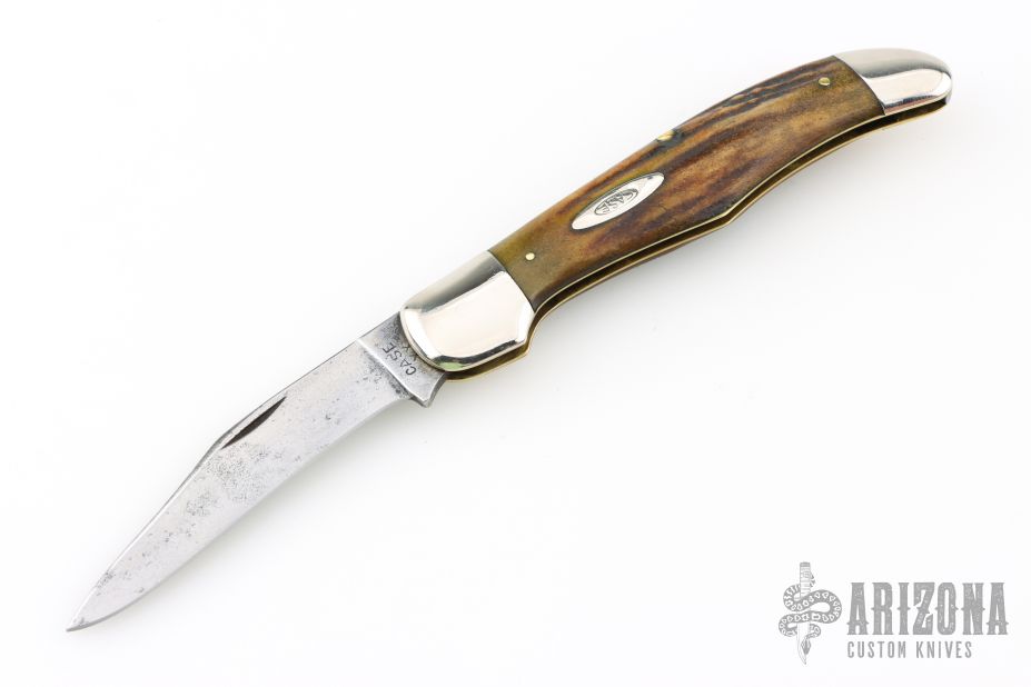 Vintage Case XX Folding Hunter features a drop point blade with nail nick. The handle has nickle silver bolsters, stag covers with a nickel silver escutcheon and brass pins, brass liners, steel spring. Has some pitting on the blade, has been resharpened, has some pitting on the spring, otherwise good condition for its age.