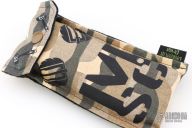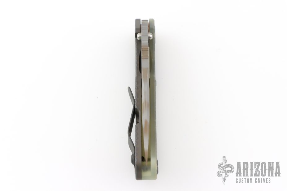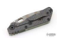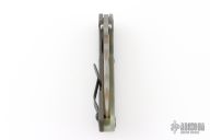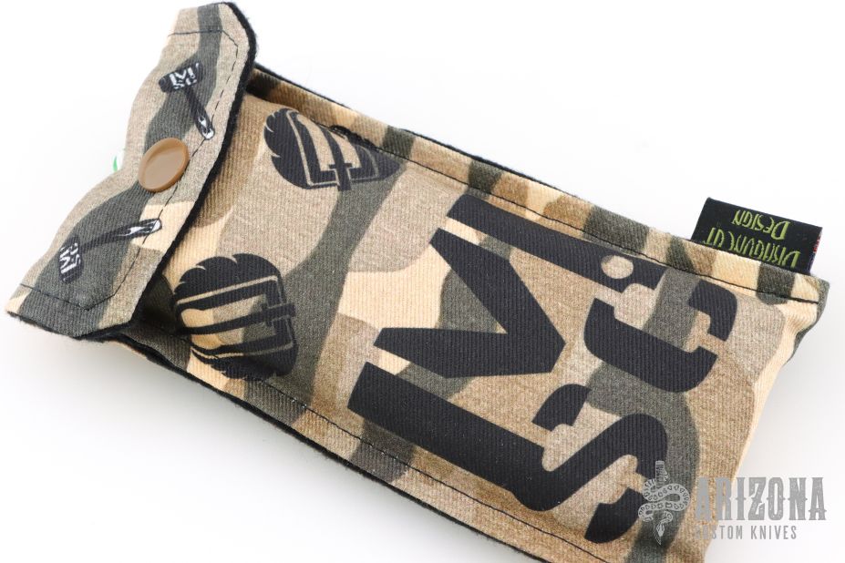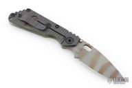 This Mick Strider SNG framelock folder features a ghost stripe blade with thumbhole and notched thumbrest. The handle has an AICS Camo G-10 and flamed titanium frame with titanium clip, tip up carry. Jimping on blade spine. Nice lockup, and blade seating. Excellent condition. Comes with a cloth pouch.